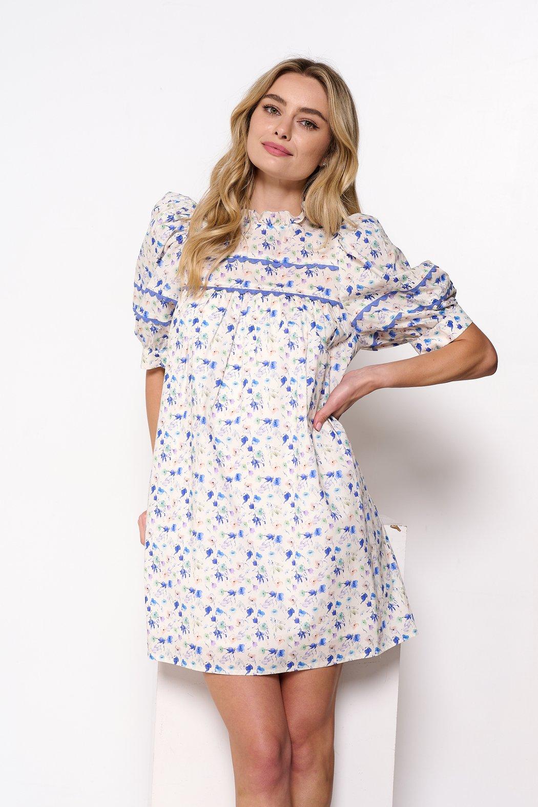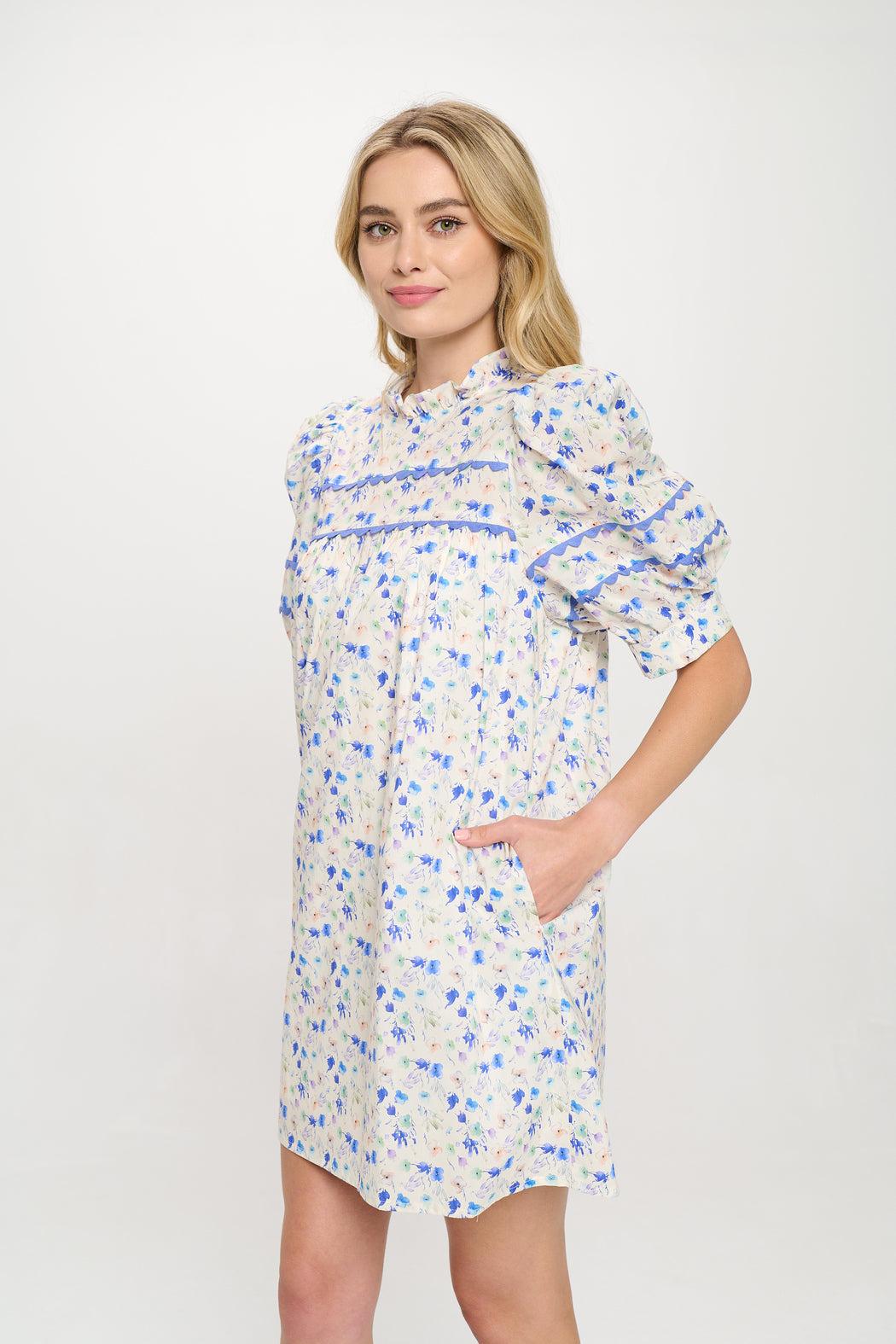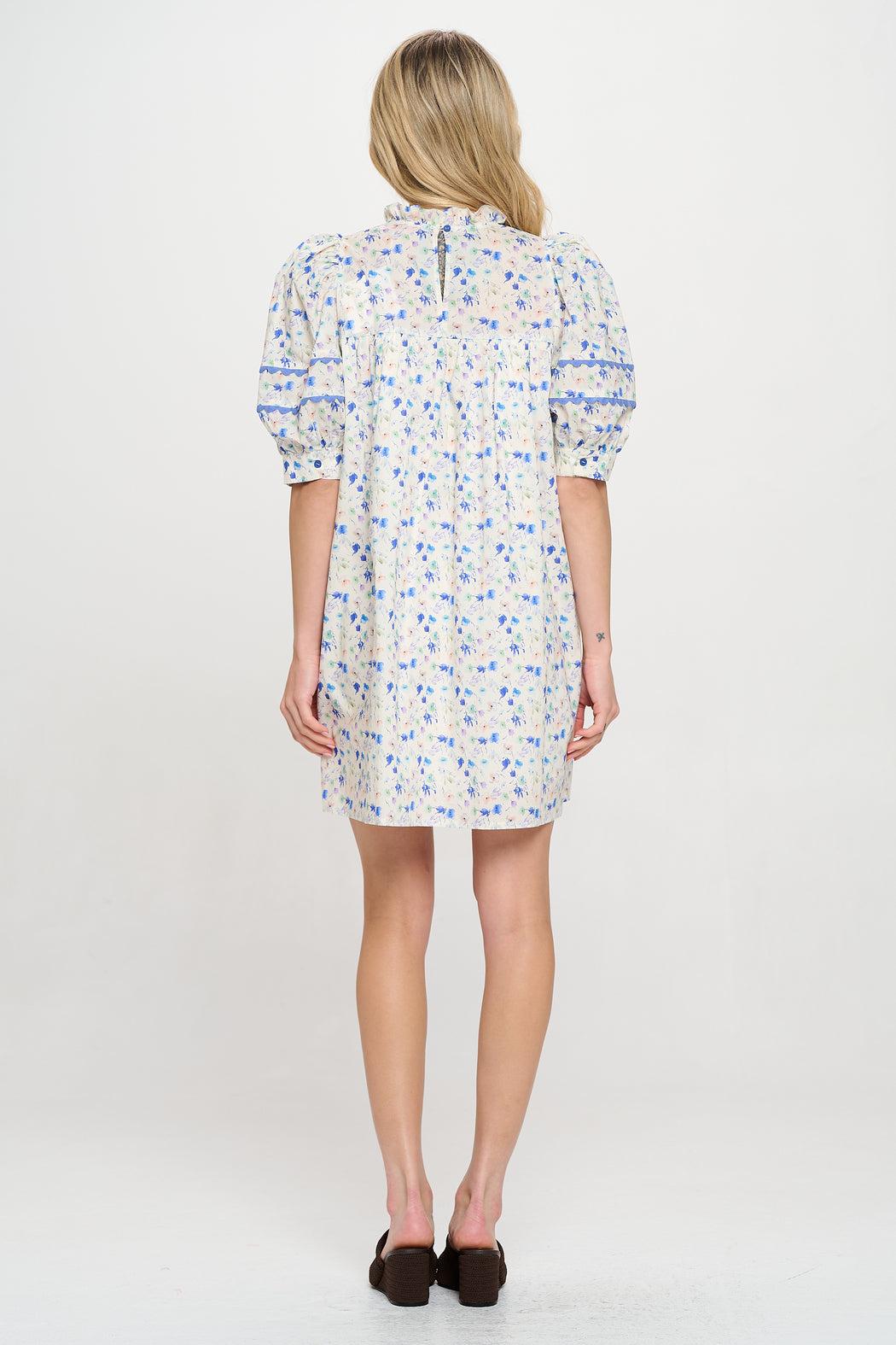 This floral mini dress blends sweet and timeless details with modern ease. Designed with puff sleeves, delicate pintuck accents, and a ruffled high neckline, it’s finished with contrast lace trim to add texture and charm. The relaxed silhouette makes it an effortless pick for brunches, baby showers, or casual spring outings.