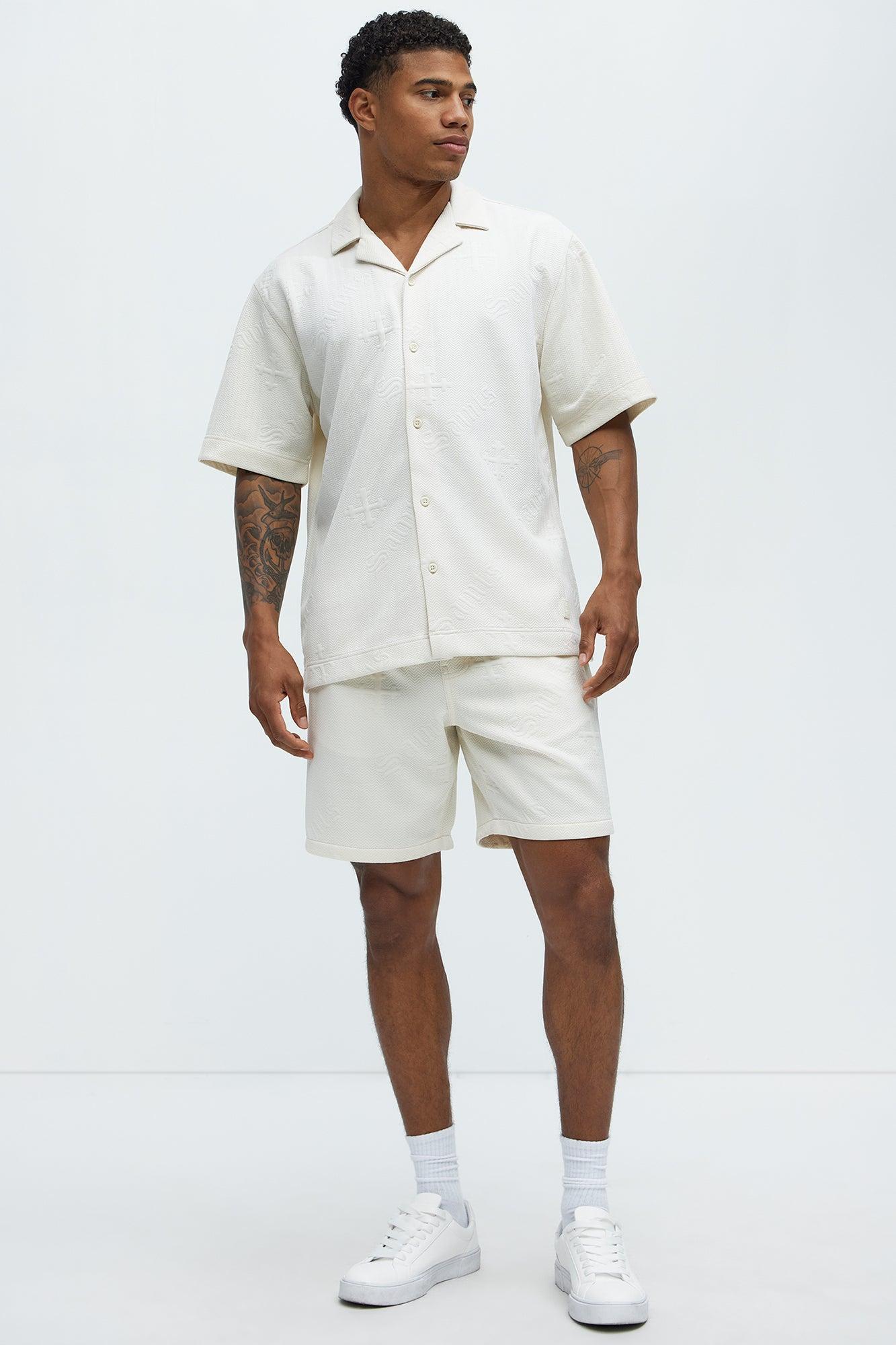 Available In Off White. Fold Down Collar Short Sleeve Front Button Closure Jacquard Fabric Pair With "Aegis Cross Embossed Relaxed Shorts" 97% Polyester 3% Spandex Imported