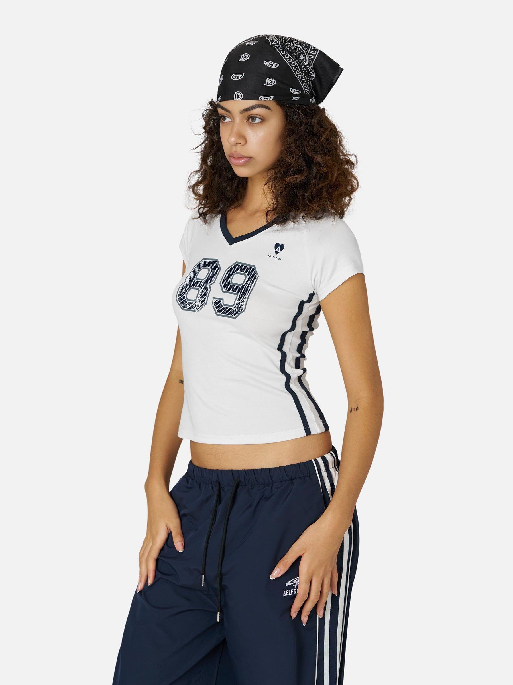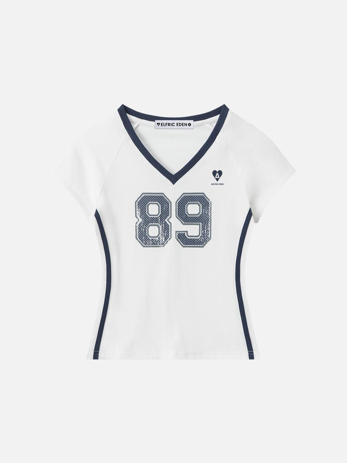 Sporty meets chic in this fitted V-neck tee, featuring bold numeric prints and a sleek silhouette. The deep neckline adds just the right touch of collarbone highlight, while contour seams accentuate your waist and enhance the waist-to-hip ratio. Whether you're jetting off or lounging in, this tee delivers flattering comfort with a confident edge. Material: 90% Cotton 10% Spandex. Clothing details: Patchwork. SIZE GUIDE
