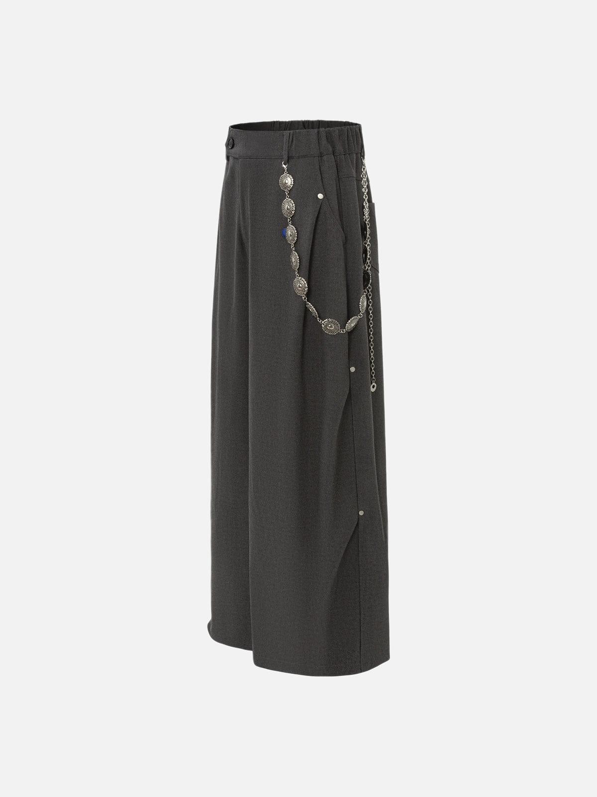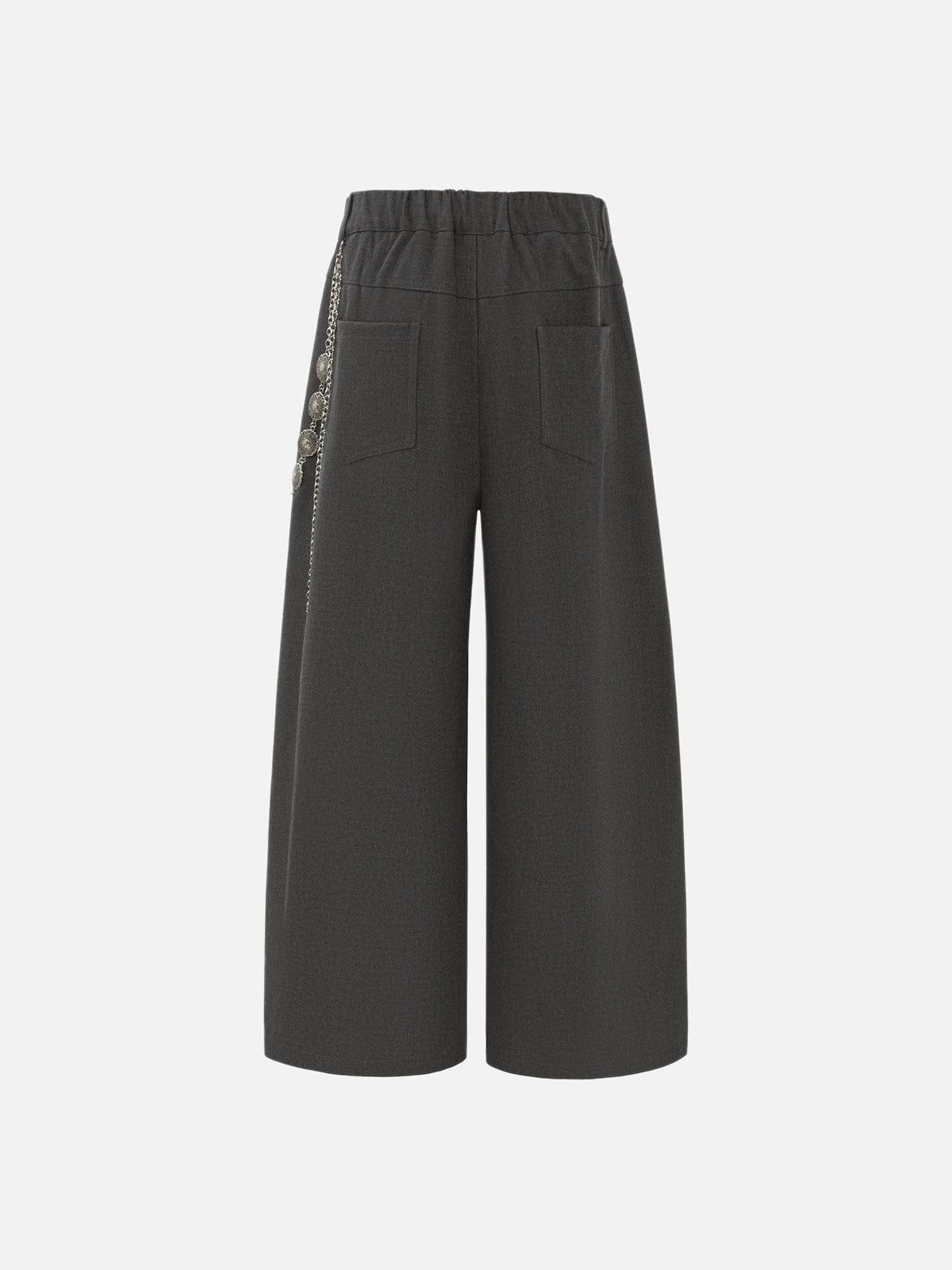 Cut in a baggy silhouette, these pants offer a relaxed drape through the leg for an effortless, laid-back fit. The chain detail adds a subtle edge, bringing a touch of attitude to the otherwise clean structure. Finished with a comfortable waistband and minimal pocket design, this piece delivers everyday wearability with a refined street-inspired feel. Material: 80% Polyester, 17% Cotton, 3% Spandex. Clothing details: Chain. SIZE GUIDE