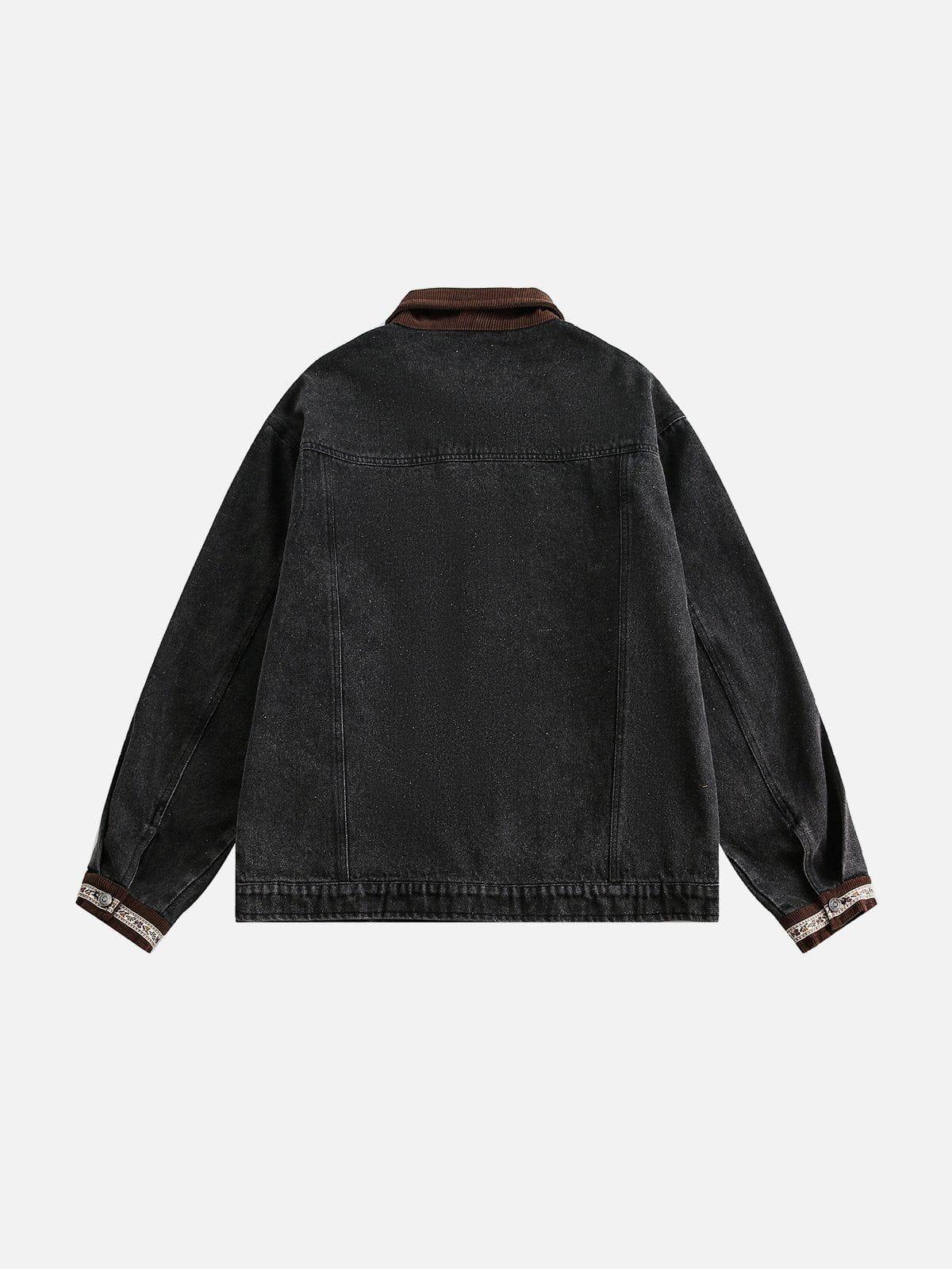 Features a unique patchwork design that combines denim with corduroy trim. The dark wash denim fabric is complemented by a brown corduroy collar and pocket flaps. The jacket also has decorative stitching details on the sleeves and pockets, giving it a unique, rugged aesthetic. Material: 85% Cotton 15% Polyester. Clothing details: Flower Patchwork. SIZE GUIDE