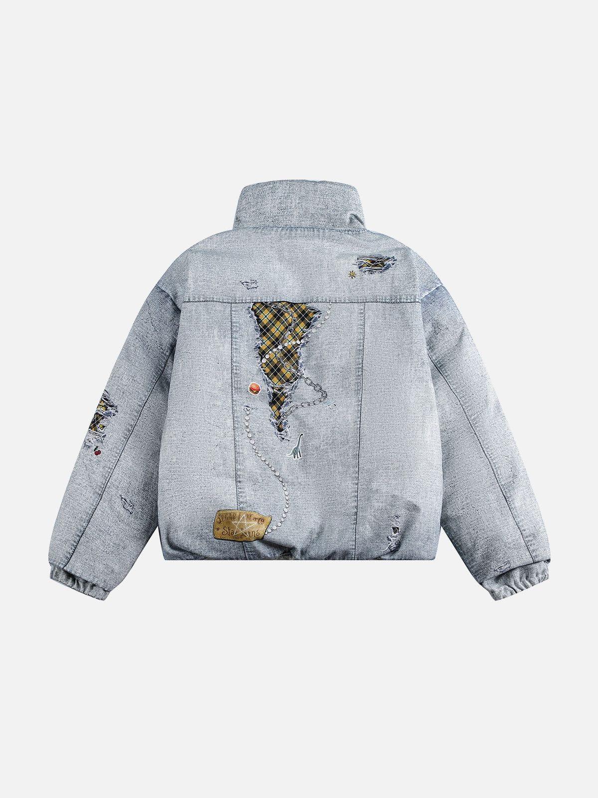 Denim Graphic Coat with a stand collar brings a fresh twist to classic denim outerwear. Detailed with expressive graphics and subtle fading, it blends structured form with a laid-back attitude for an effortlessly cool look. Material: 60% Cotton 40% Polyester. Clothing details: Denim Graphic. SIZE GUIDE