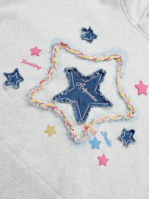 Unveil casual charm with our hoodie, showcasing a central canvas star embellished with vibrant cords, forming a stellar silhouette. Complemented by petite pentagrams, it radiates playful elegance.Material: 65% Cotton, 35% Polyester. Clothing details: Denim Star, Thick Interior.SIZE GUIDE