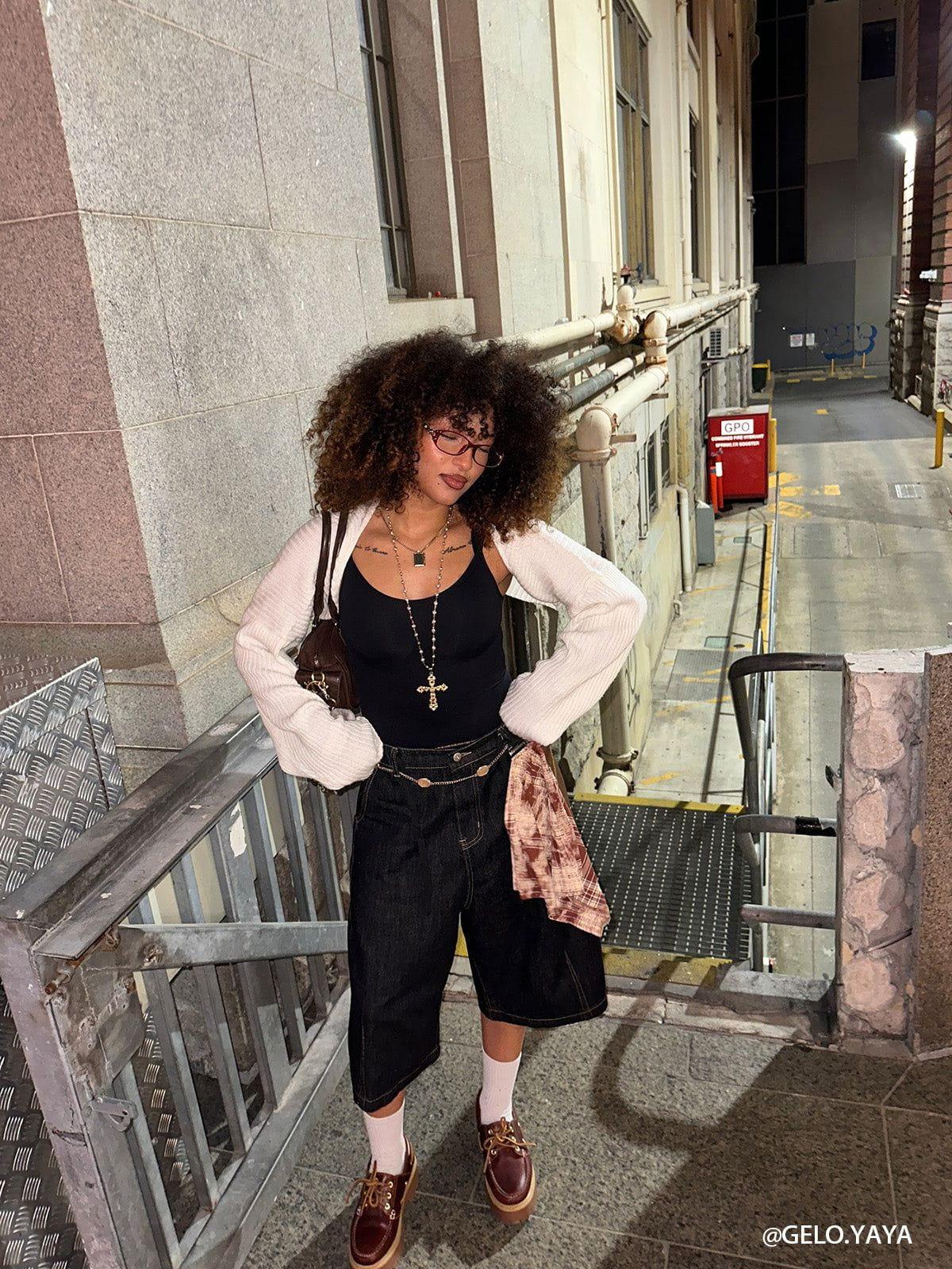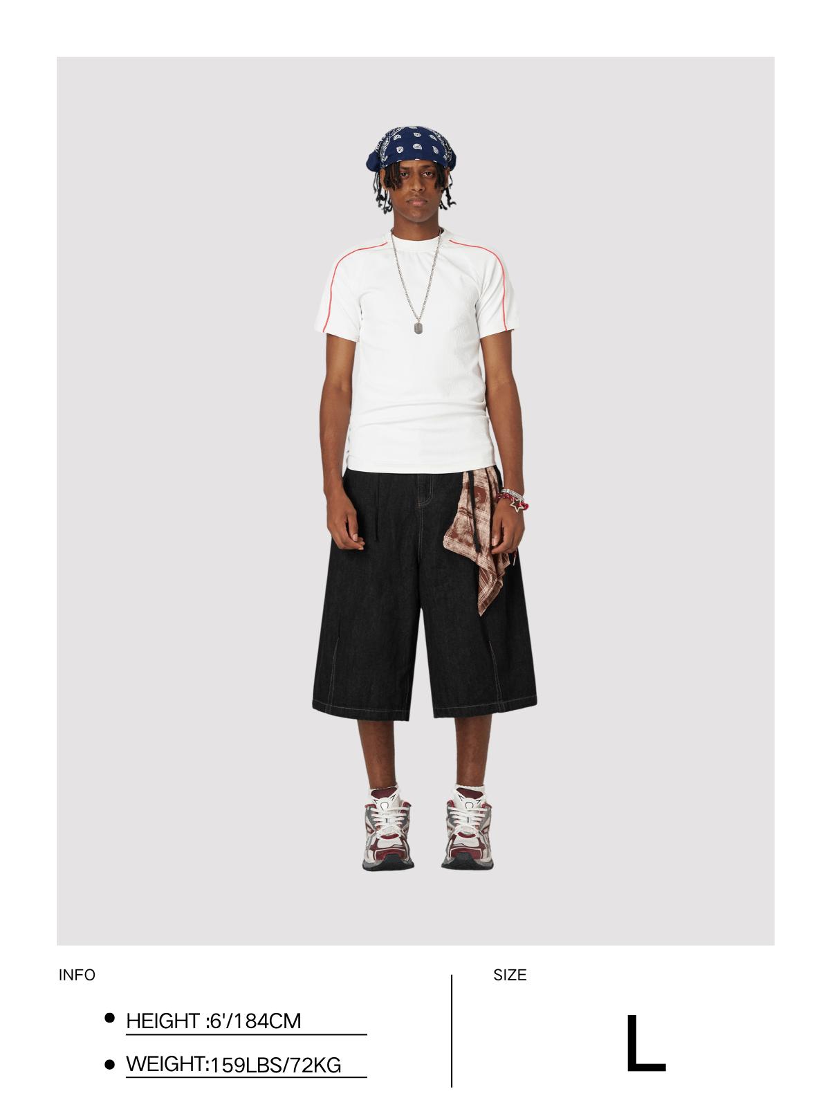 Crafted in classic black denim, these long shorts feature a bold red plaid kerchief for a striking visual punch. Detach the kerchief to instantly switch to a clean, commuter-friendly look—perfect for workdays. Reattach it to channel street-cool vibes or vacation-ready flair in seconds. Kerchief Styling Tips:~ Decorative Use: DIY Kerchief-tying techniques add a visual pop to your jorts.~ Practical Use: Can be used as a belt to solve the issue of loose waistbands. It also doubles as a handy handkerchief for wiping sweat or cleaning items. Material: 85% Cotton 15% Polyester. Clothing details: Plaid Kerchief. SIZE GUIDE