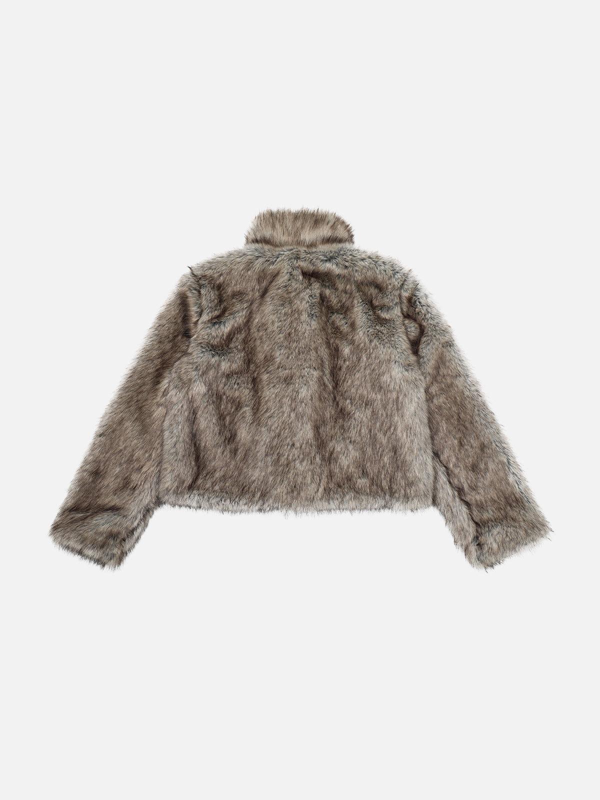 Made from plush faux fur, this cropped coat features a soft stand collar and clean panel construction. The dense texture adds warmth and volume, while the short length keeps the silhouette balanced and easy to layer over everyday outfits. Material: 100% Polyester. Clothing details: Faux Fur. SIZE GUIDE