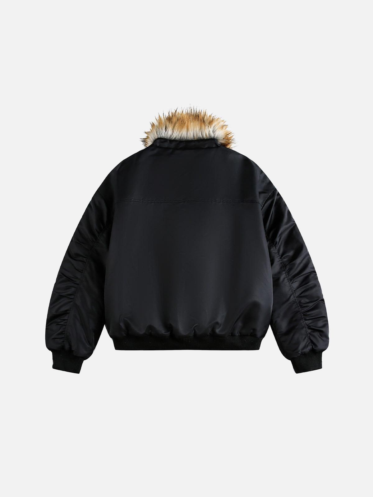 A bold winter layer built around a dramatic faux-fur panel that instantly elevates a simple outerwear silhouette. The smooth shell balances the oversized fur texture, creating a strong visual contrast, while the relaxed cut keeps it easy for everyday street styling. A statement coat that turns cold-weather dressing into something sharp, warm, and unmistakably standout. Material: 100% Polyester. Clothing details: Faux Fur. SIZE GUIDE