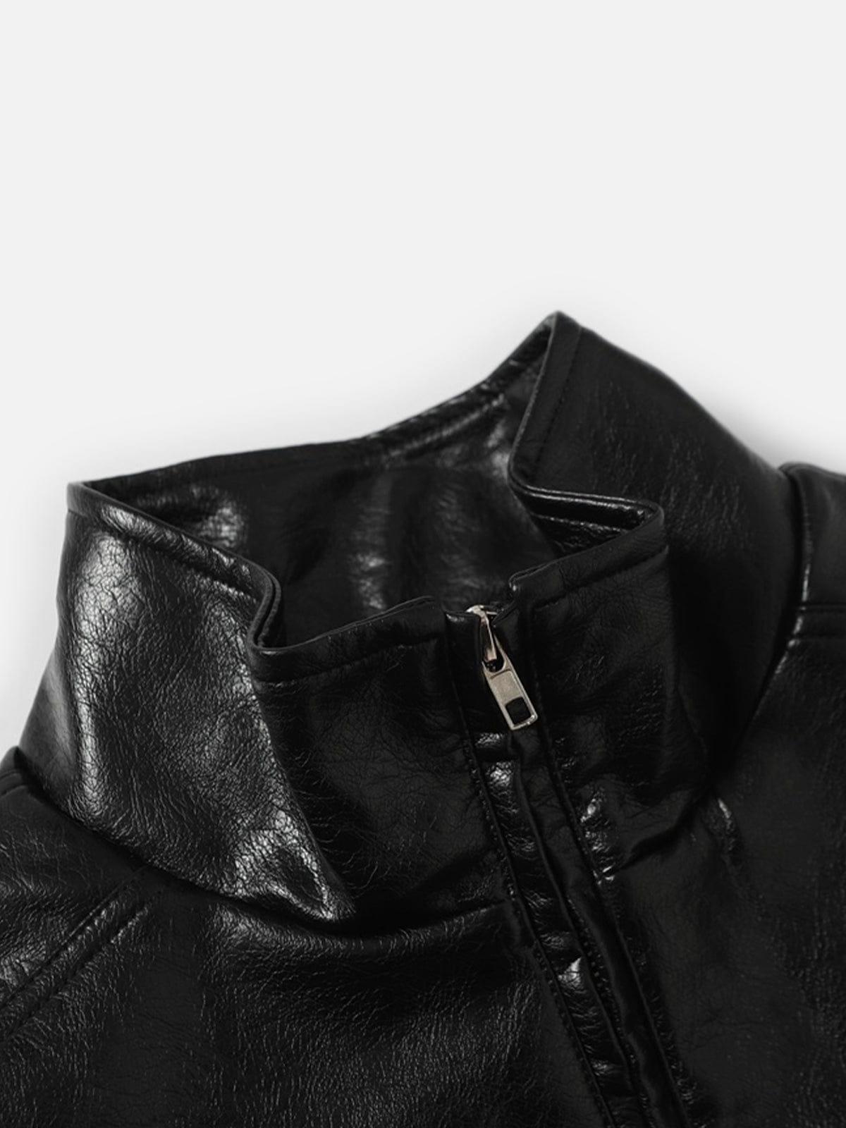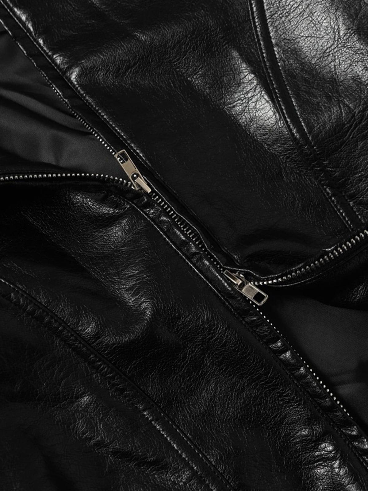 Elevate your outerwear with this faux leather zip-up jacket, built in a clean, structured silhouette that brings instant edge. The smooth leather-look finish adds a bold sheen, while the boxy cut keeps it modern and easy to style. A sleek high collar and subtle panel details round out the design, making it a versatile statement layer for everyday wear.Material: 50% Polyurethane 50% Cotton.Clothing details: Arc Patchwork.SIZE GUIDE