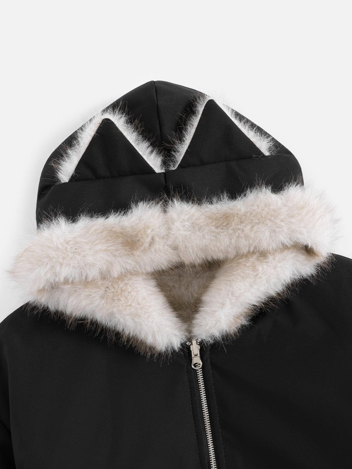 Double the style, double the attitude. This reversible faux fur hooded coat flips between sleek outerwear and plush texture, giving you two distinct looks in one piece. The playful cat-ear hood adds a bold, signature twist, while the cozy build keeps you warm without losing edge. A standout layer that switches vibes as easily as you do. Material: 100% Cotton. Clothing details: Cat Ear, Faux Fur Collar. SIZE GUIDE