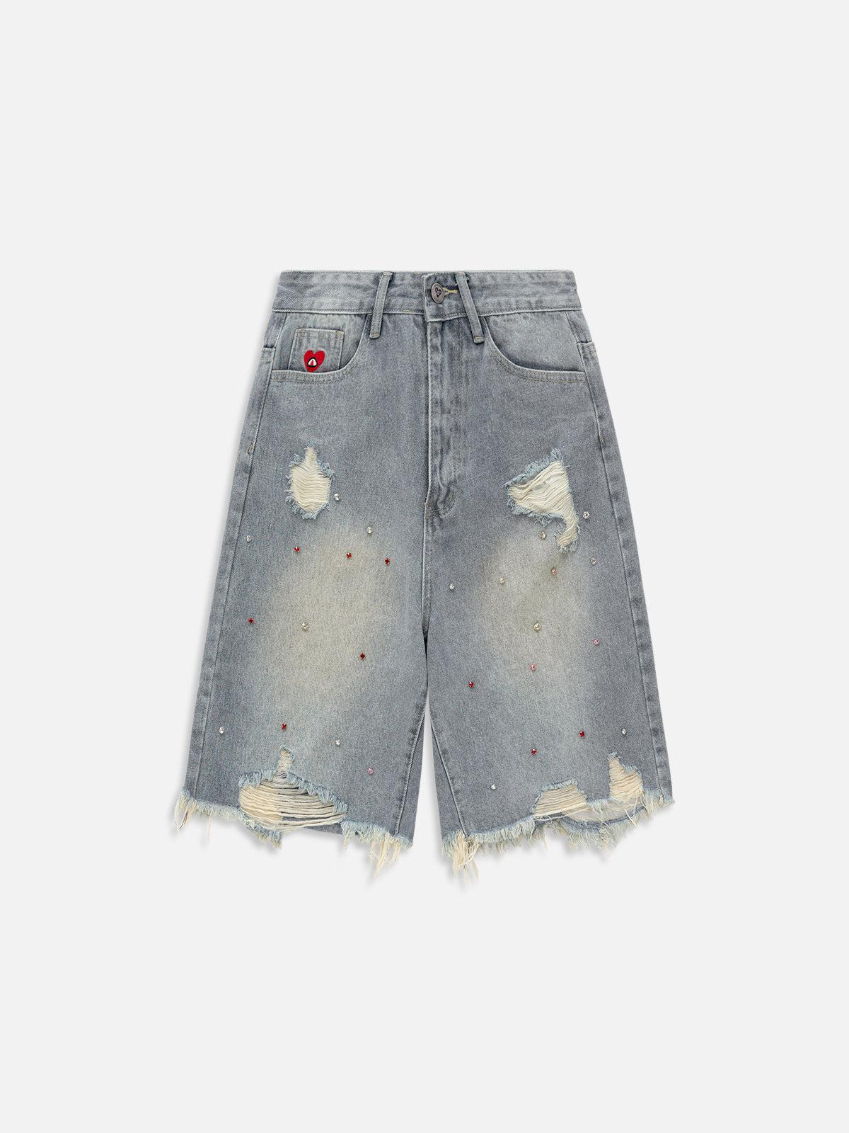 Add a touch of playfulness to your wardrobe with our Aelfric Eden Rhinestone Application Jorts. These simple denim shorts feature a unique distressed hem and adorable rhinestone detailing, giving a classic look a fun twist. Note: Our newest products come with the addition of our Heartie embroidery on the pocket, distributed at random. Thank you for your continued support! Material: 65% Cotton 35% Polyester. Clothing details: Distressed. SIZE GUIDE