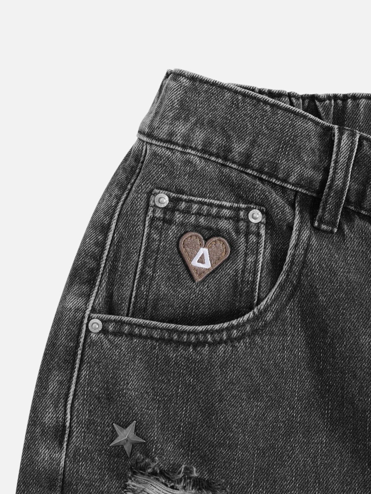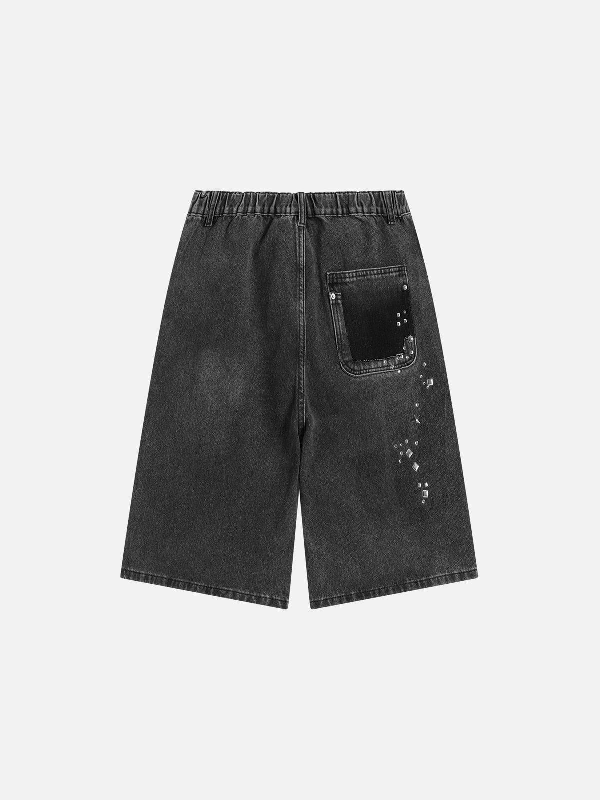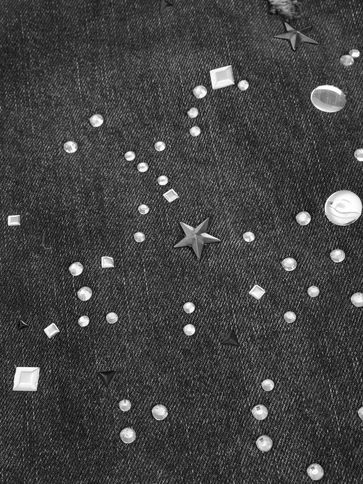 Crafted from washed black denim, these jorts are accented with scattered rhinestone detailing that adds a subtle shine and refined edge. Light distressing gives them a naturally worn-in feel, while the relaxed silhouette keeps the look effortless and wearable. The focus stays on texture and sparkle rather than bold graphics, making them easy to style with graphic tees, jerseys, or hoodies for a clean yet eye-catching street fit. Material: 80% Cotton, 10.7% Viscose, 9.3% Polyester. Clothing details: Rhinestone. SIZE GUIDE