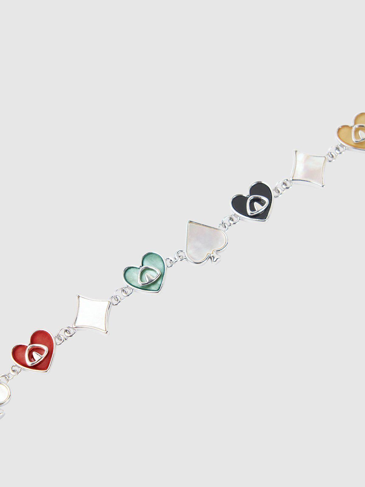 Inspired by playing cards, this bracelet features spades, diamonds, clubs, hearts, and our beloved "Heartie" character. The vibrant colors and unique design create a striking visual impact, perfect for any fashion-forward individual. Material: Alloy. Total chain length: 23 cm (9 inches) max. Details: Adjustable Length.