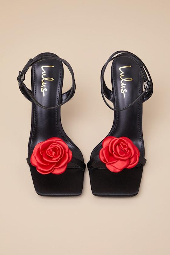 The Lulus Aerianna Black and Red Satin Rosette Ankle Strap Sandals pair best with cute mini dresses and your flawless charm! These too-cute heels are composed of sleek woven satin that shapes a trendy square footbed and a slender toe strap adorned with a red rosette detail. Matching straps sprout from the sides to wrap and secure around the ankle with a silver buckle, all atop a chic blade heel.