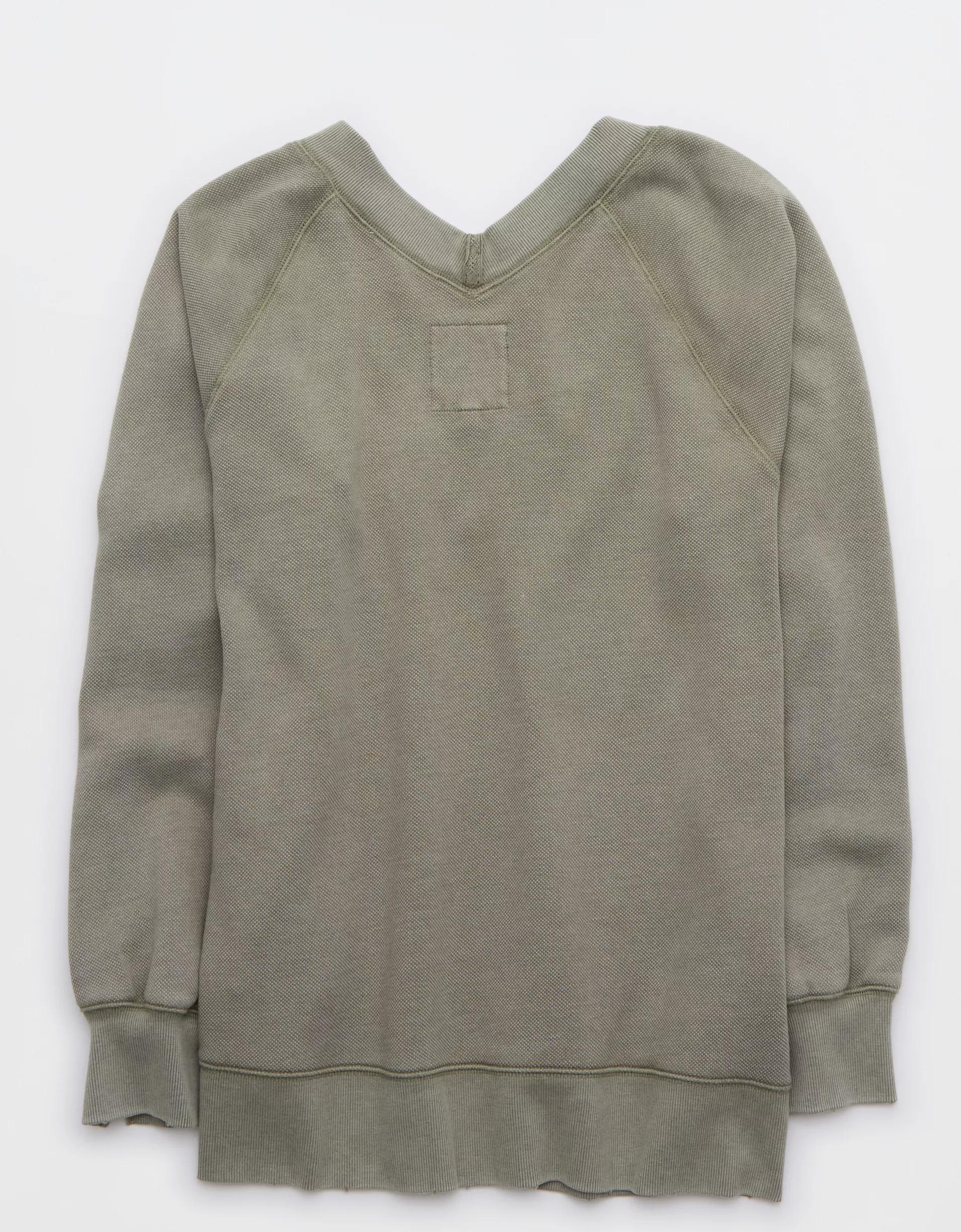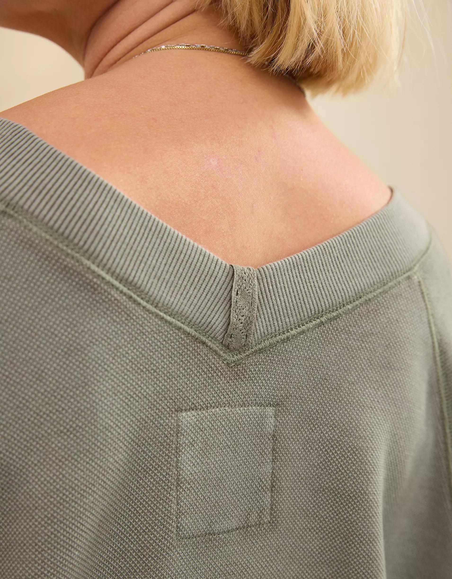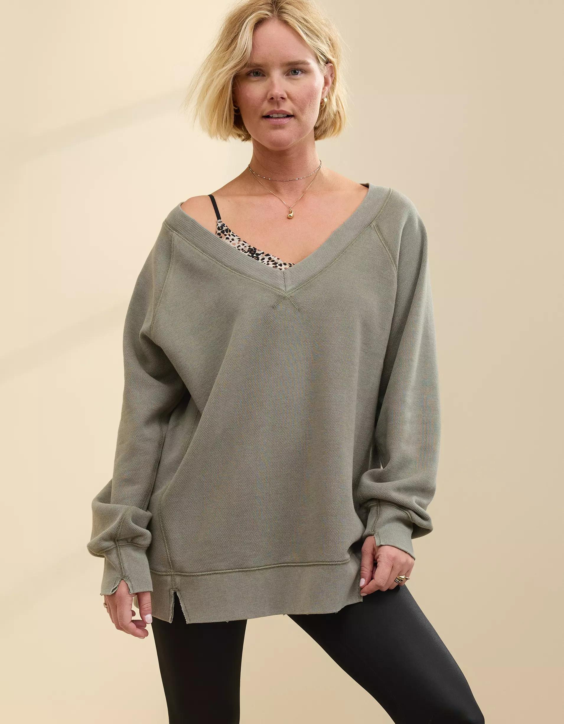 The big love is back in its iconic double v-neckline, now with a super cozy drape and a textural & light fleecy update. We added deets to obsess over, too!