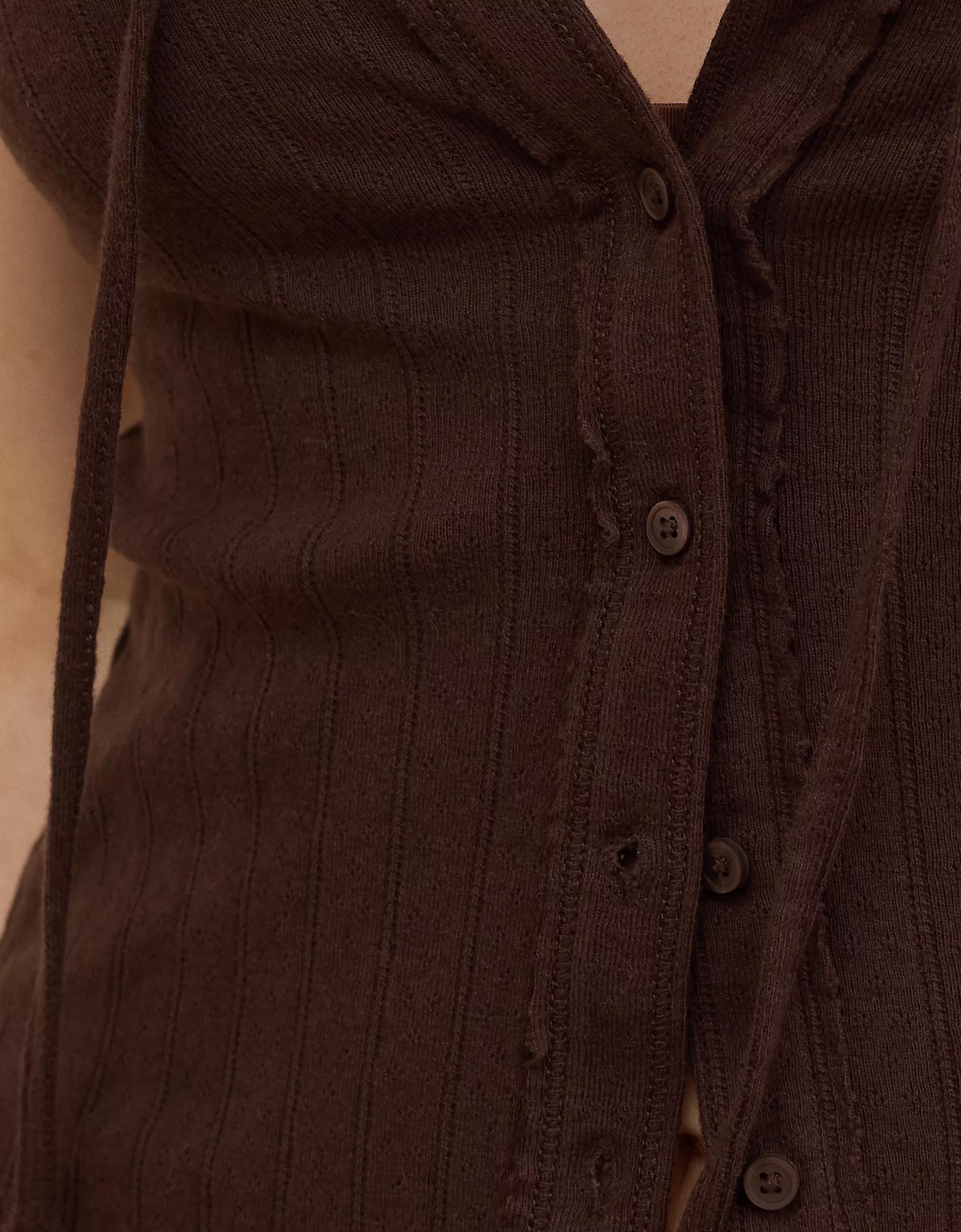 Soft and cozy pointelle fabric/Adjustable string on necklineâperfect for tying a bow/Functional buttons/Curved hem with raw edge deets/Accessibility deets: over-the-head access for easy on/off!!
