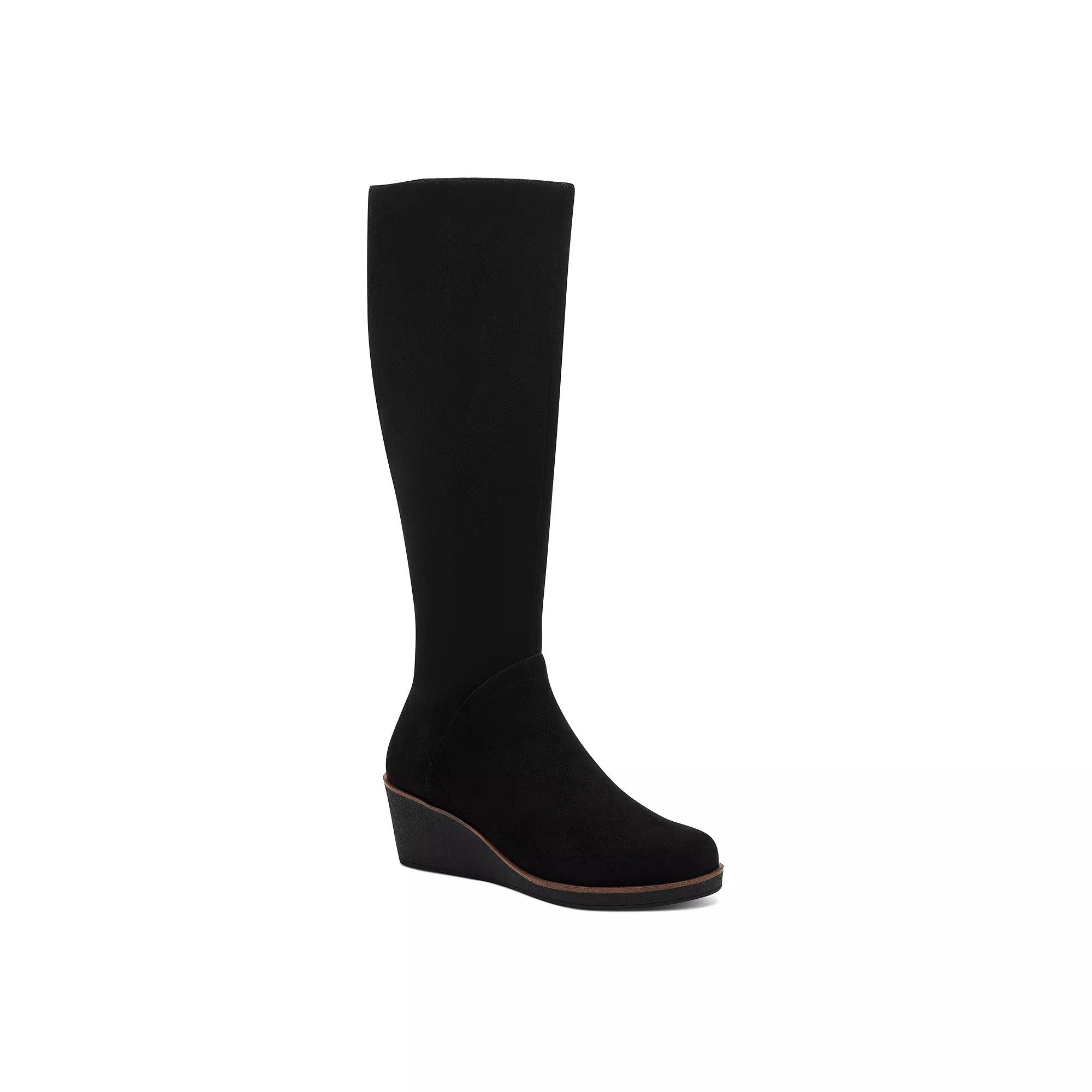 Step up your fall looks with these Aerosoles Binocular women's wedge knee-high boots. Click this FOOTWEAR GUIDE to find the perfect fit and more! - https://www.kohls.com/feature/shoesizeguide.jsp. SHOE FEATURES: Side zipper for easy on and off, Wedge heel. SHOE CONSTRUCTION: Faux suede upper and lining, Rubber outsole. SHOE DETAILS: Round toe, Zipper closure, Padded footbed, 2.25-in. heel, 0.5-in. platform, 16-in. shaft, 15.25-in. to 17-in. circumference, Spot clean, Imported. Size: 9 Med. Color: Black Faux Suede. Gender: female. Age Group: adult.