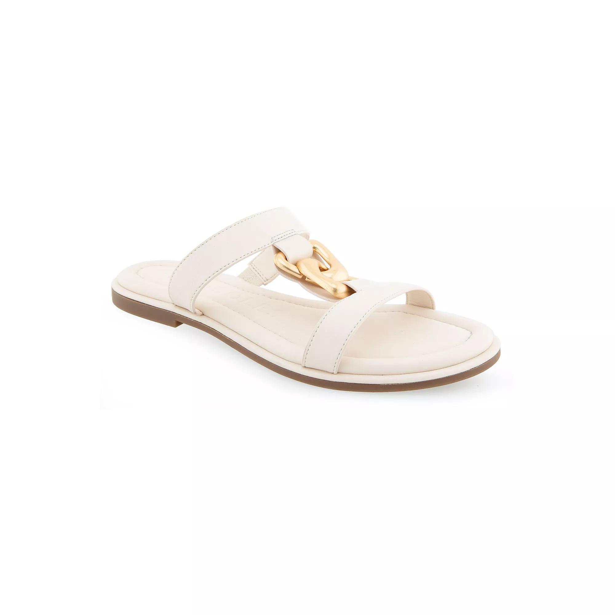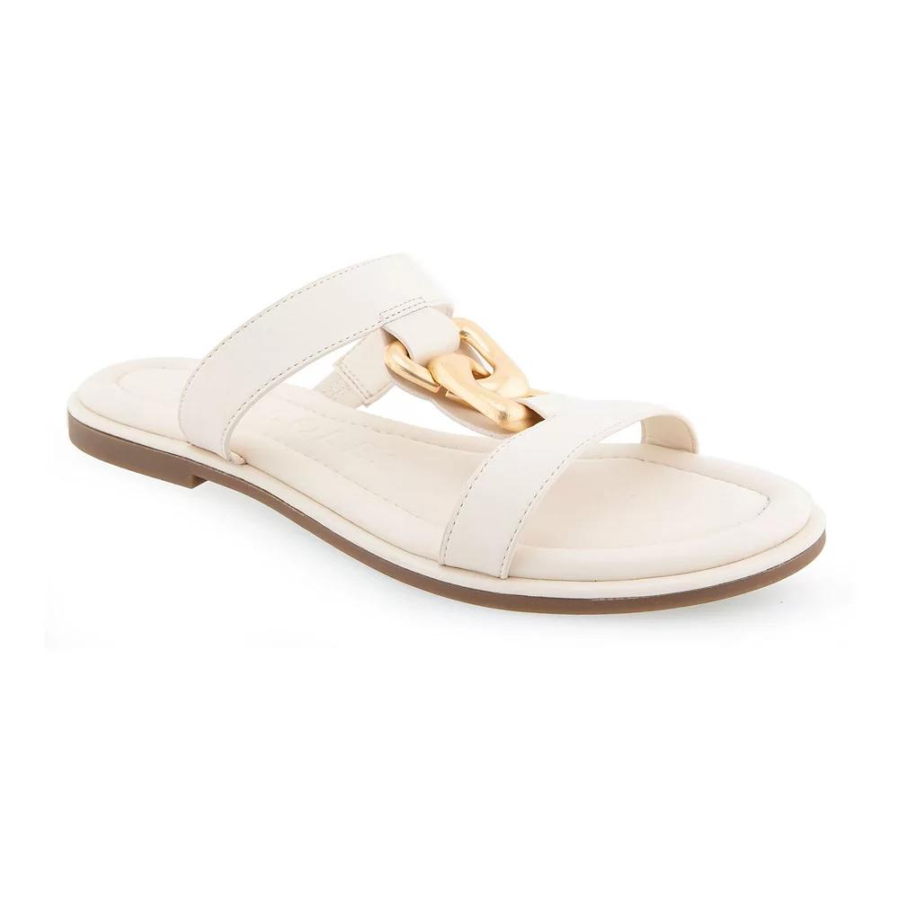 Be fashion-forward with these Aerosoles Geraldine womens flat slide sandals. Click this FOOTWEAR GUIDE to find the perfect fit and more! Be fashion-forward with these Aerosoles Geraldine womens flat slide sandals. Click this FOOTWEAR GUIDE to find the perfect fit and more! FEATURES Link chain design upper Foam footbed for all day comfort Slip-on for easy on and offDETAILS Faux leather upper Synthetic lining and midsole Rubber outsole Round toe Slip-on Foam footbed 0.75-in. heel Spot clean Imported Size: 8. Color: White. Gender: female. Age Group: adult.