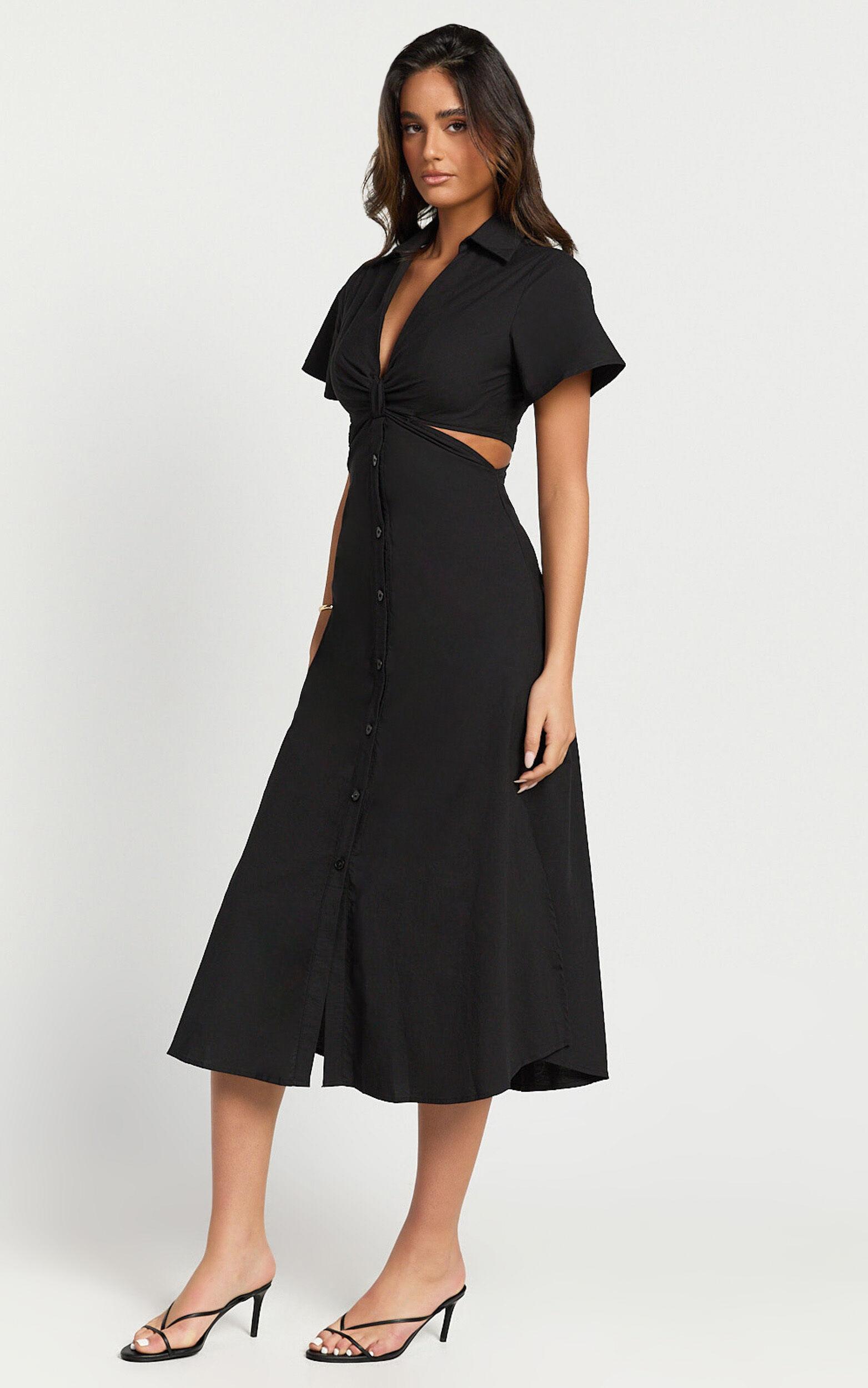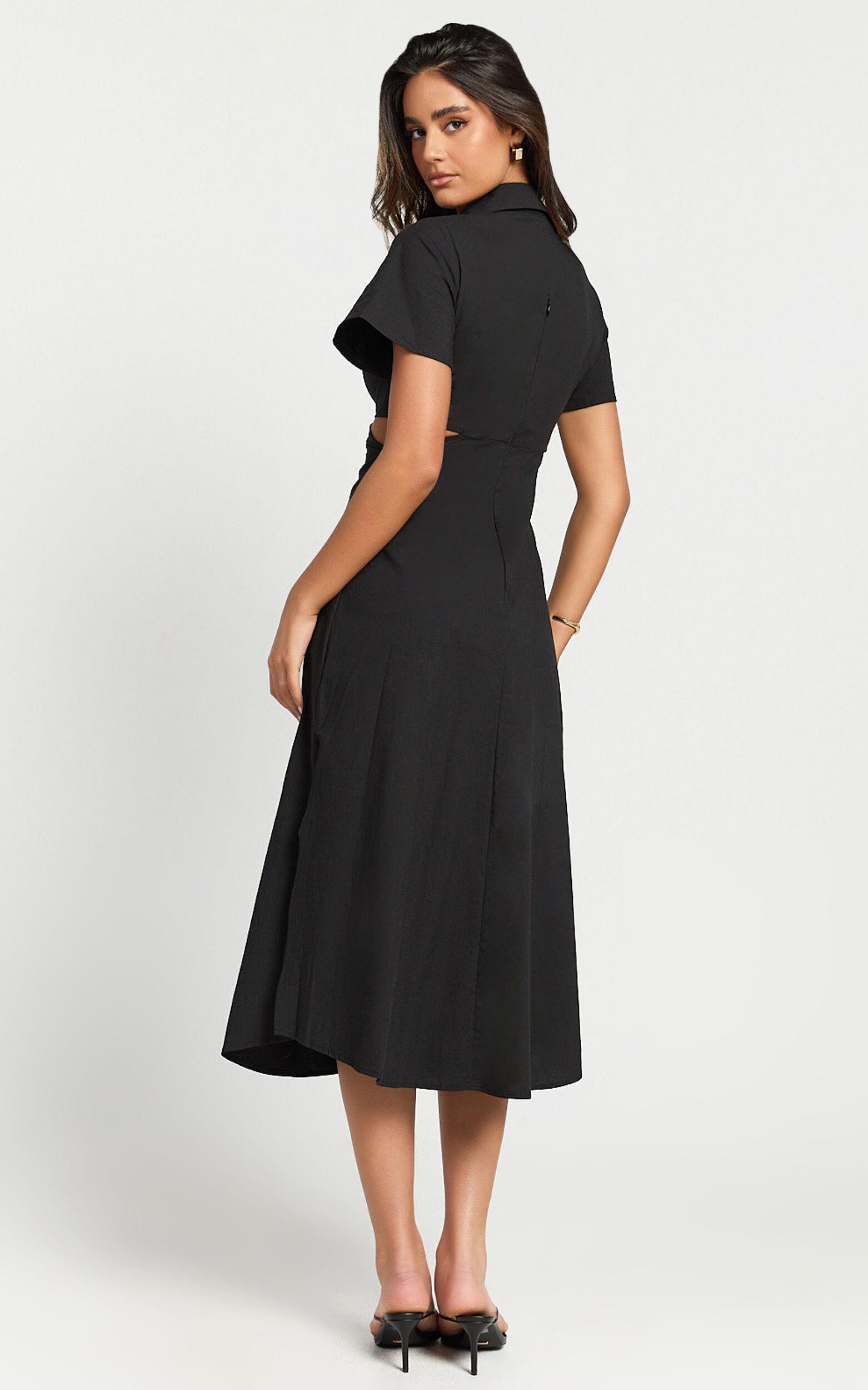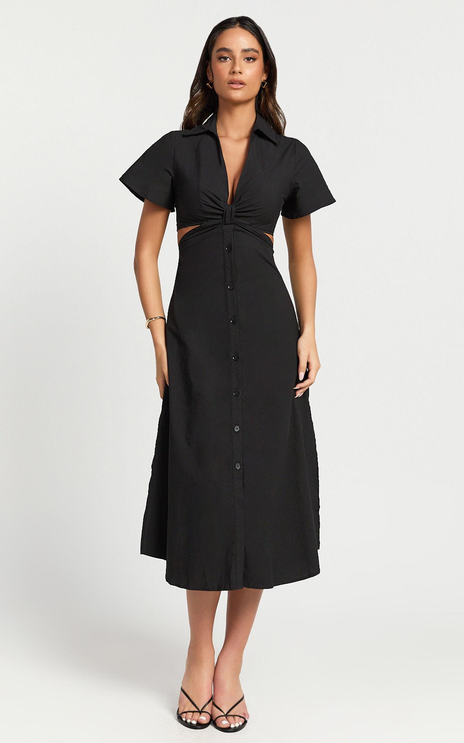 Transform your look with the Aeryn Midi Dress - a true embodiment of effortless elegance and unique style. Meticulously crafted from soft, breathable cotton, this dress promises not just comfort but a statement that speaks volumes about your distinct taste in fashion. Its stunning black hue makes it a versatile piece that can transcend occasions, ensuring you're always dressed to impress whether it's a casual brunch or an evening out with friends.Product Details:Zips detailShirt DressCotton fabricPlunge necklineCasual wearMidi lengthShort SleeveSize and FitSize S / 8 length: 127cm / 50inMaterial and Care100% CottonNo StretchNatural FibresThe main fabric of this product is made from 100% Natural Fibres. Whilst some of these fibres still have detrimental impacts in their supply chain, Natural Fibres have a reduced overall impact compared to a raw polyester.