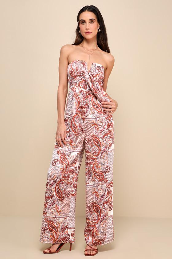 Bask in the sun in perfect style when you're wearing the Lulus Aesthetic Perfection Ivory Paisley Tie-Front Strapless Jumpsuit! Sleek woven satin boasts a Boho-chic, rust red-toned paisley print as it shapes a strapless, tie-front bodice with a notched sweetheart neckline (with hidden V-bar support and no-slip strips). Fitted waist tops wide legs that finish at full-length hems. Hidden zipper/clasp at back.