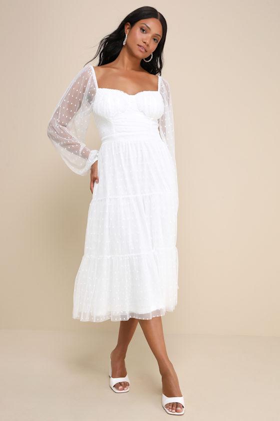 Get ready to love the way you look, 'cause the Lulus Affectionate Aura White Swiss Dot Tiered Bustier Midi Dress is totally charming! Airy mesh fabric, with an allover Swiss dot pattern, shapes this romantic dress that has sheer long sleeves (with elastic at the cuffs) and a bustier-inspired bodice with a banded waist. Tiered skirt falls to a midi hem to complete the look. Hidden zipper/clasp at back.