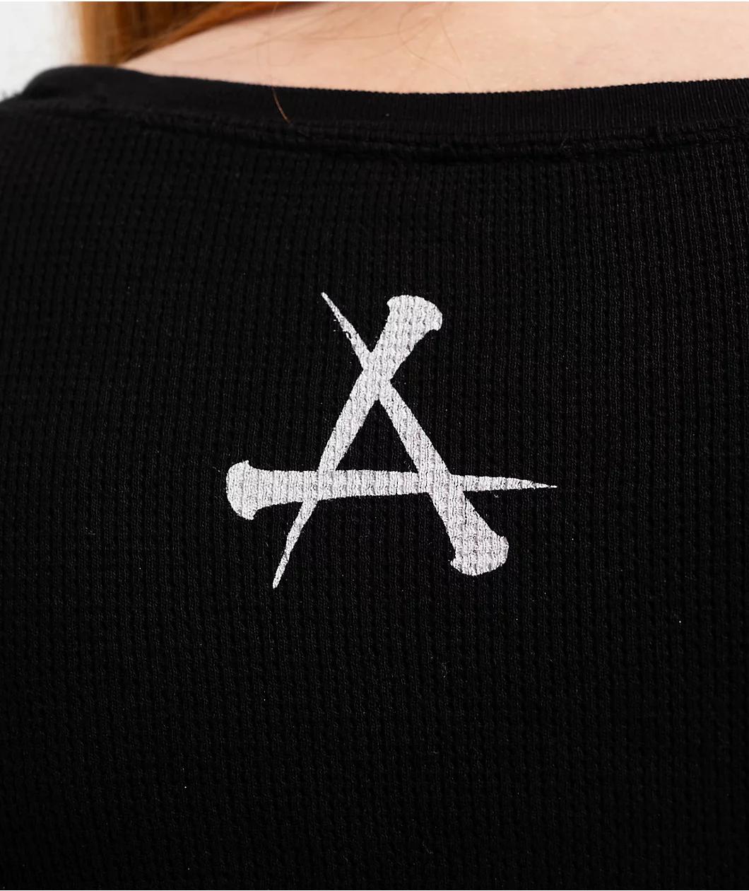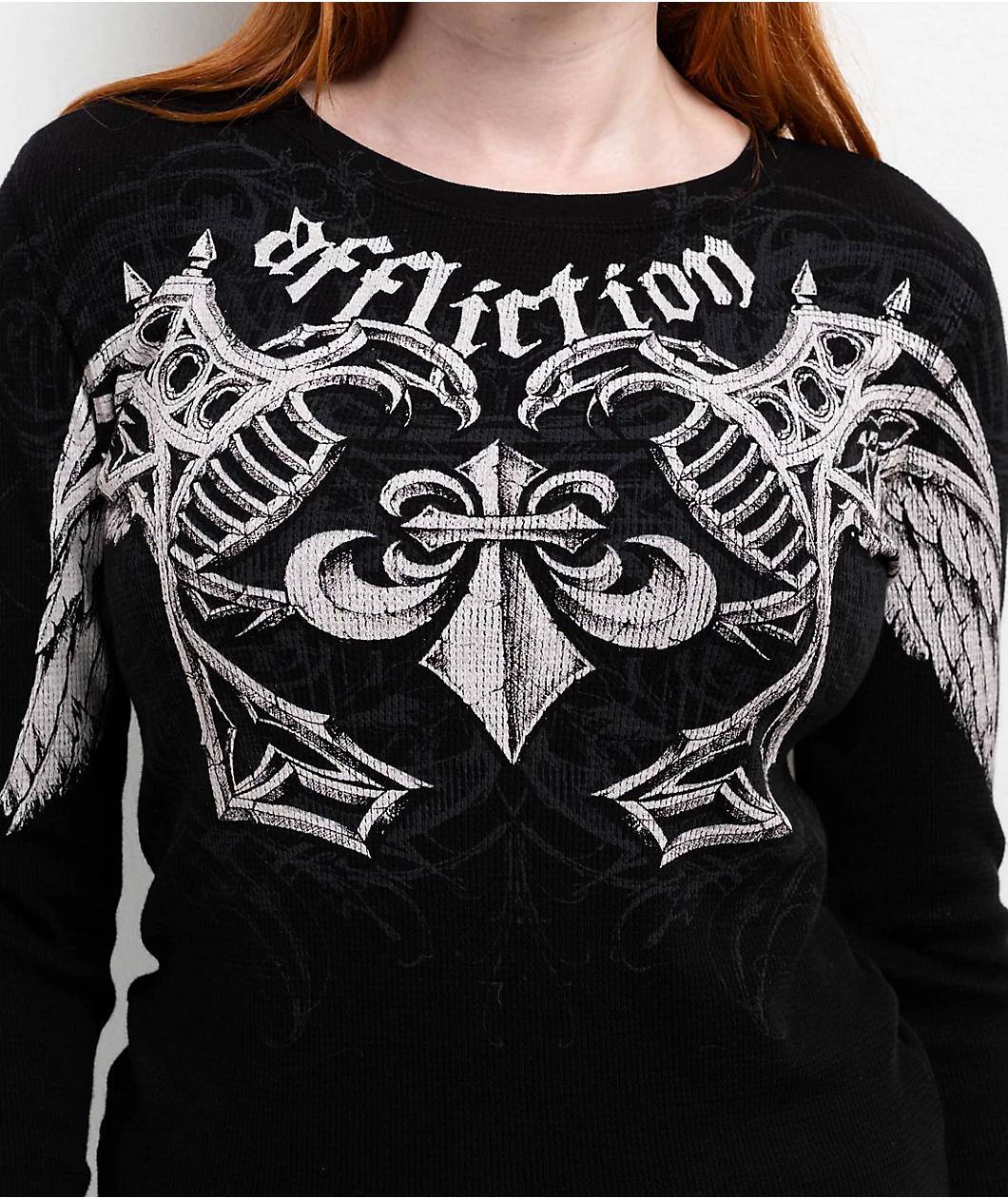 Designed with a slim bodycon construction for a flattering look, the black Agulias long sleeve thermal t-shirt from Affliction is perfect for staying warm in cold weather. The front and shoulders of the knit top feature grey fleur-de-lis and wing ima