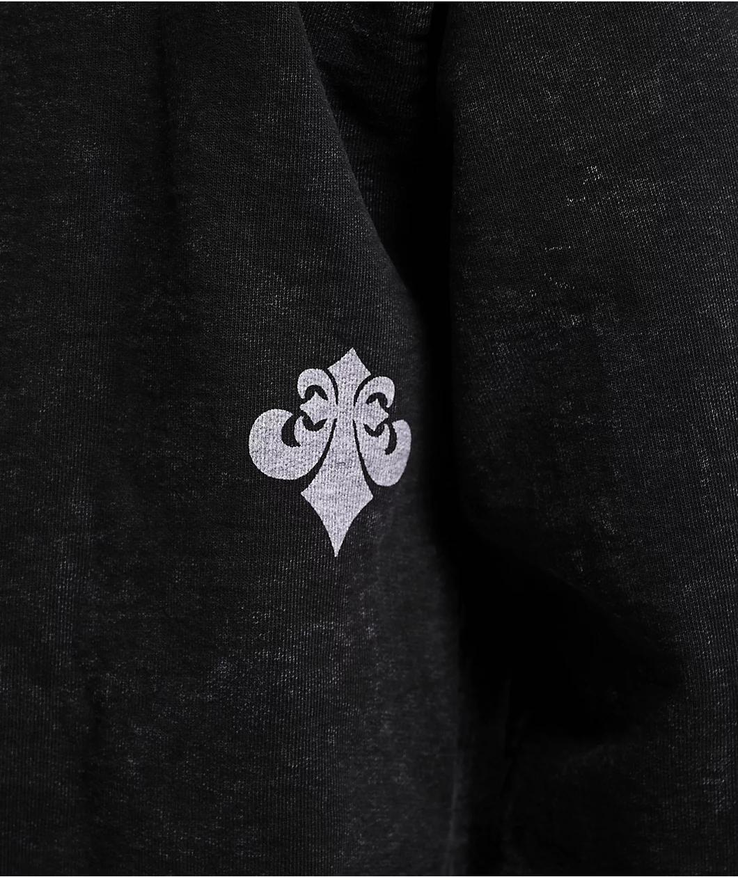 Add an edgy look to your outfit with the Ayala hoodie from Affliction in a black "Lava" wash colorway. The front of the pullover has tough branding across the chest adorned with a bold cross, a fleur de lis emblem, and large wings on either side of t