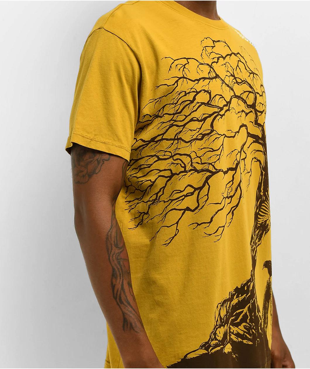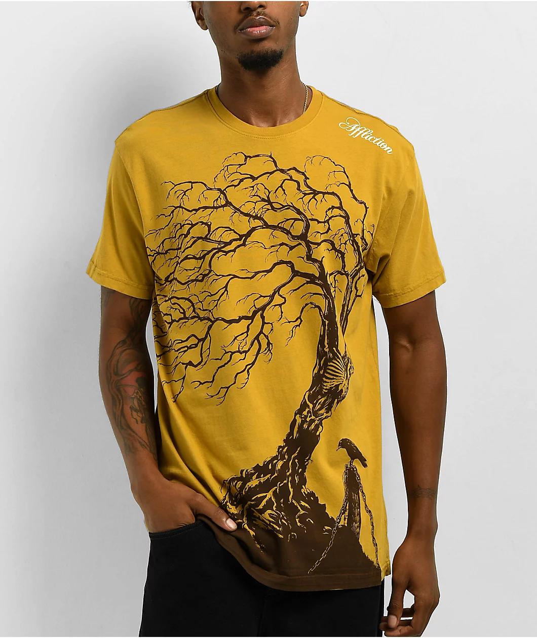 This 2000s-inspired Binded t-shirt from Affliction arrives in a "Golden Spice" yellow colorway with screen-printed graphics on the front for a loud look. The imagery on the front of the unique short sleeve depicts a skeleton and a crow Binded to a tr