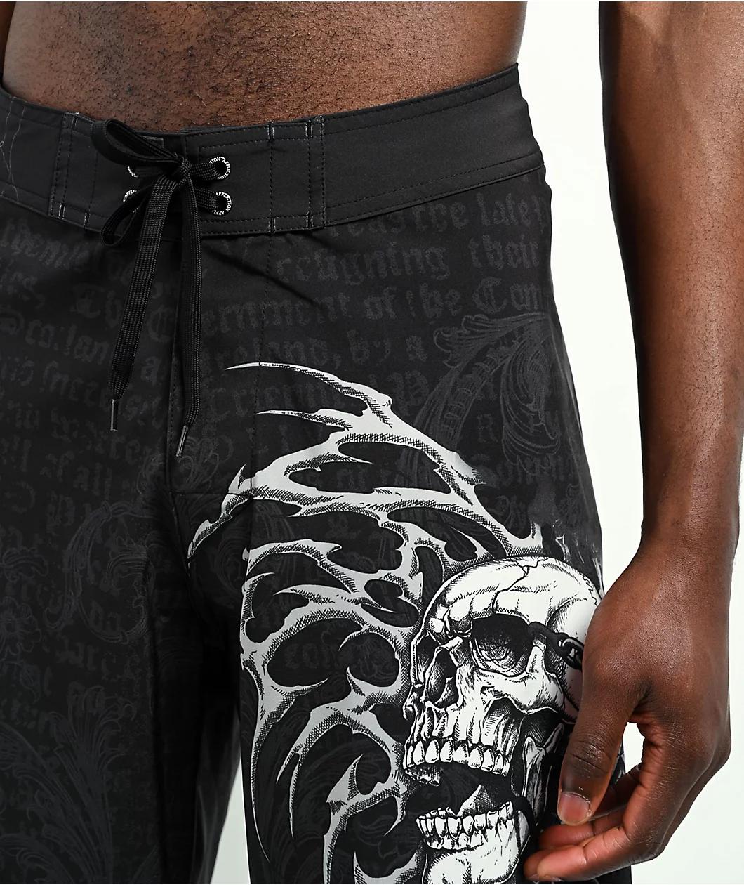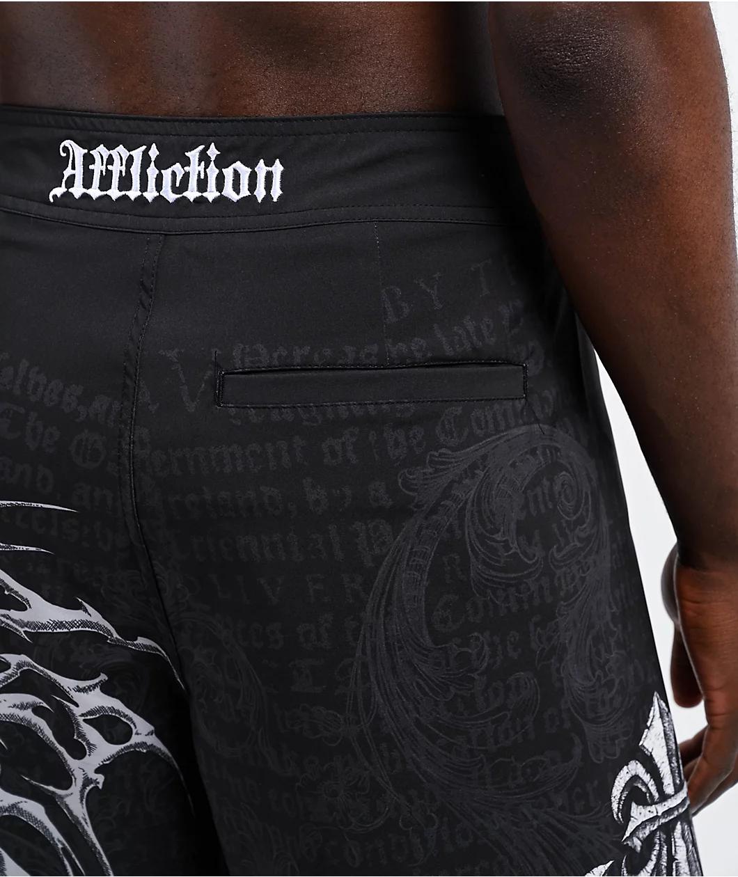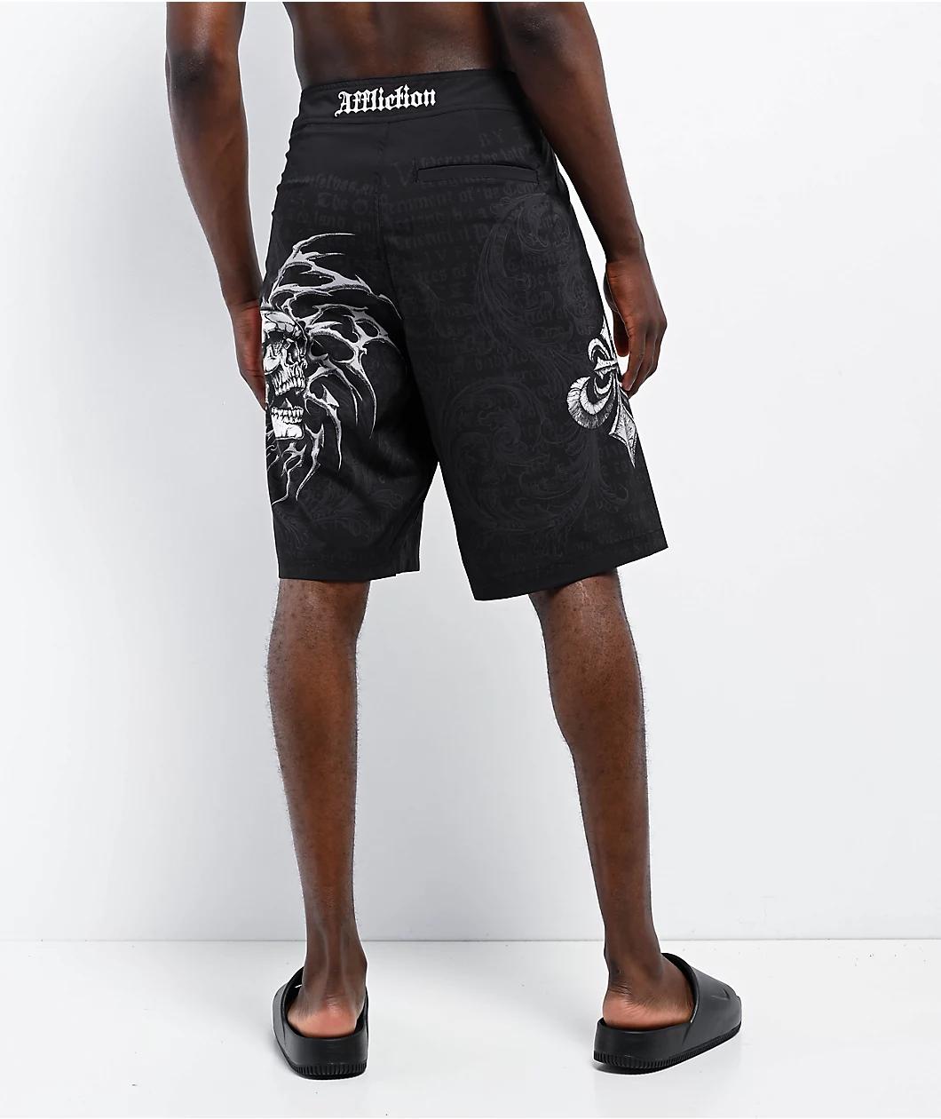 Offering dark vibes in the sunshine, Affliction introduces the Collapse board shorts in a black polyester build with printed graphics throughout. Boasting a fleur-de-lis logo on the right leg and a chained skull with a cyber sigilism design on the ri