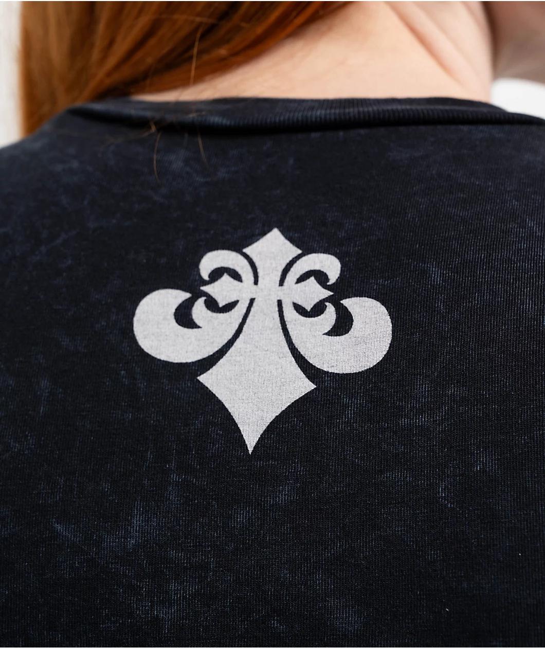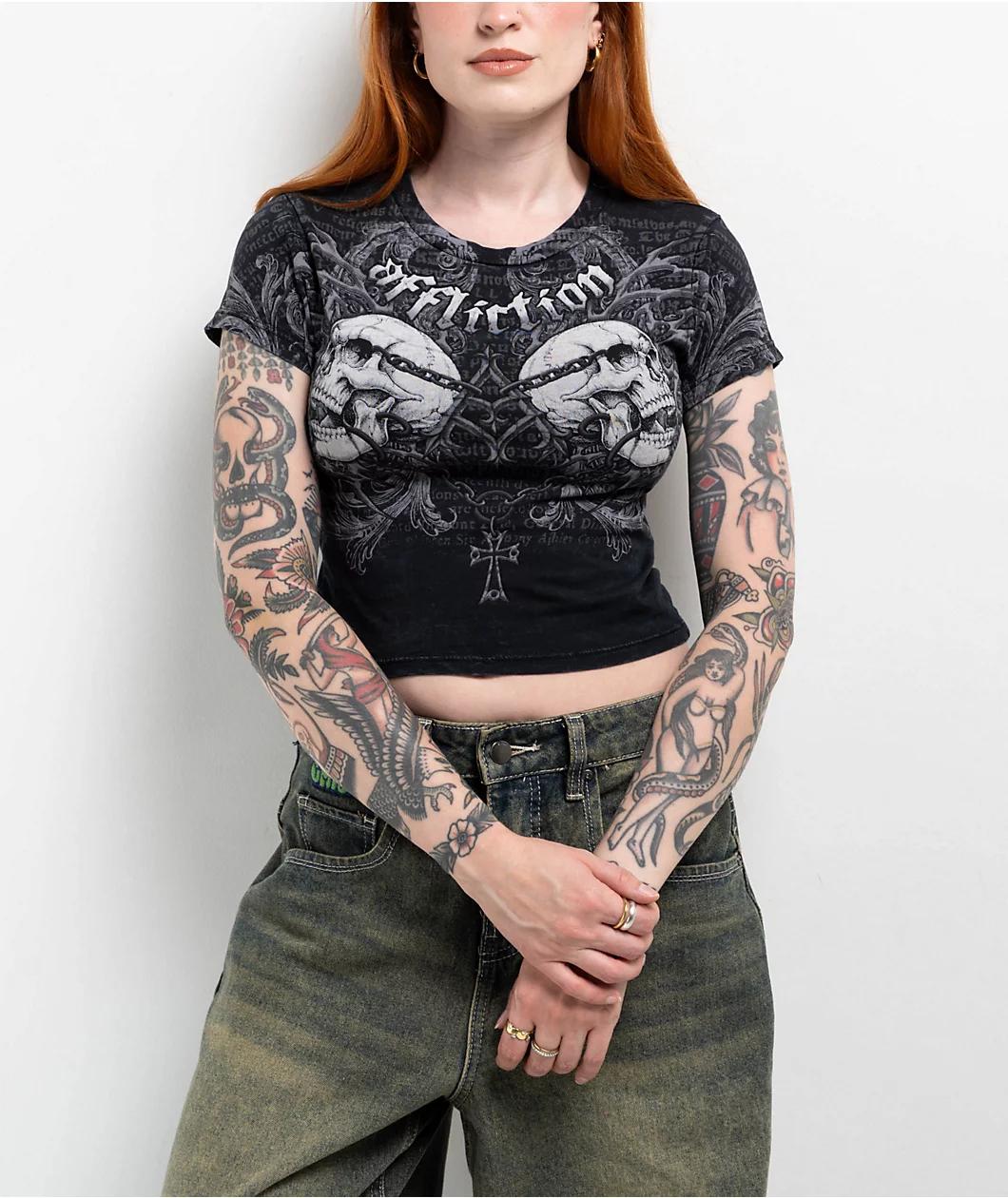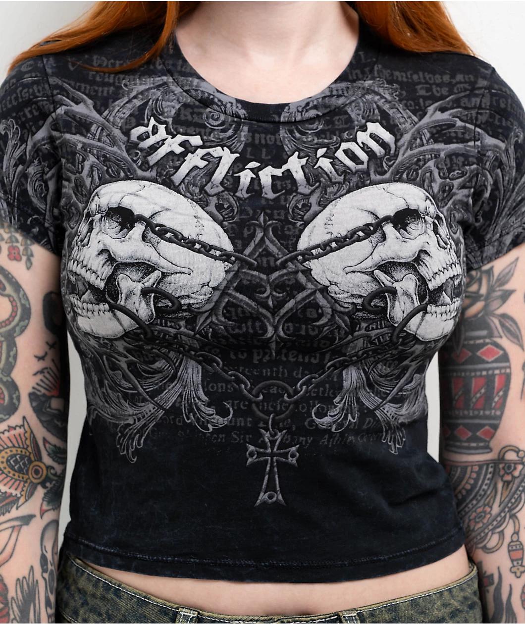 With a soft look from a black lava wash, the Collapse crop t-shirt from Affliction is perfect for adding casual gothic style to any outfit. A front graphic of chained skulls against a background of dark grey Old English text stretches across the ches