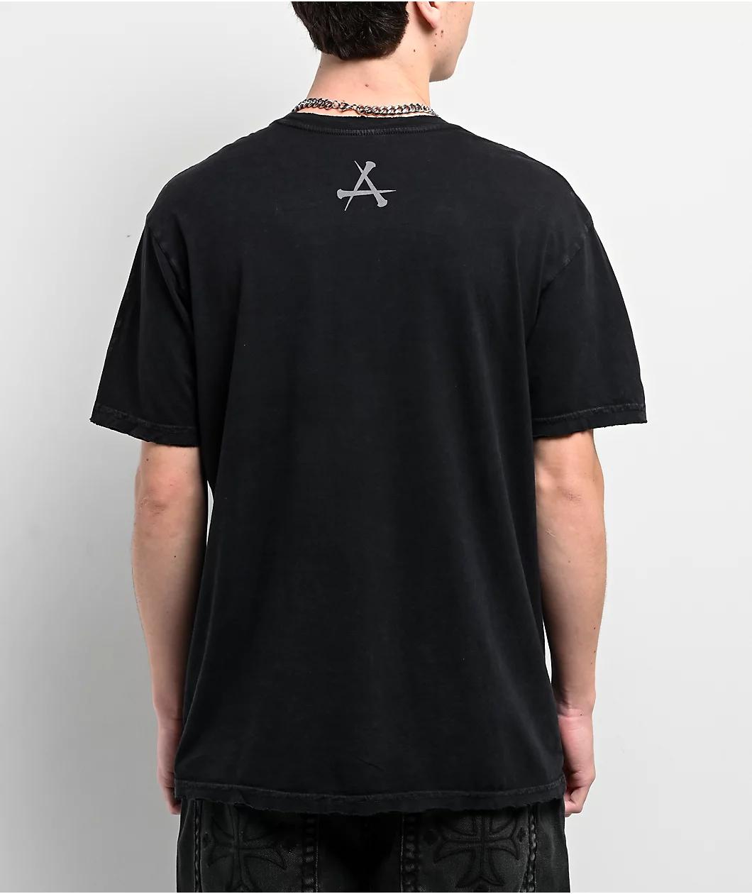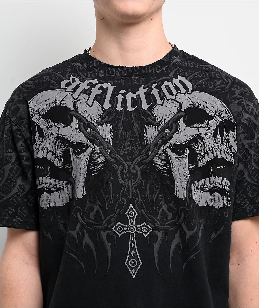 Add a gothic vibe to any outfit with the Decimation t-shirt from Affliction. Arriving in a black colorway, the tee features art on the front of two chained skulls for a bold alternative look. Distressed detailing throughout gives the top a touch of v