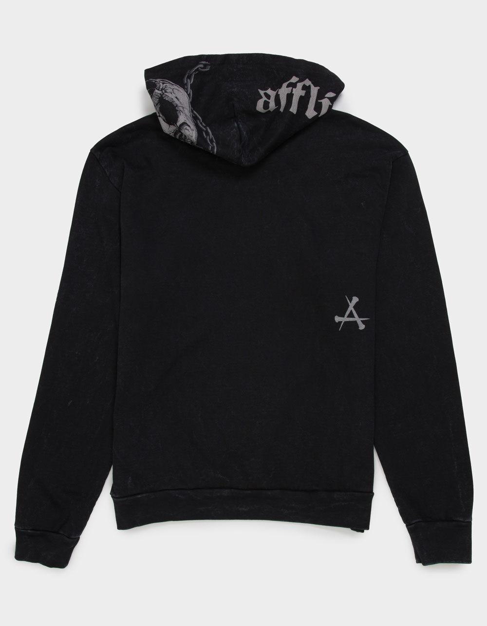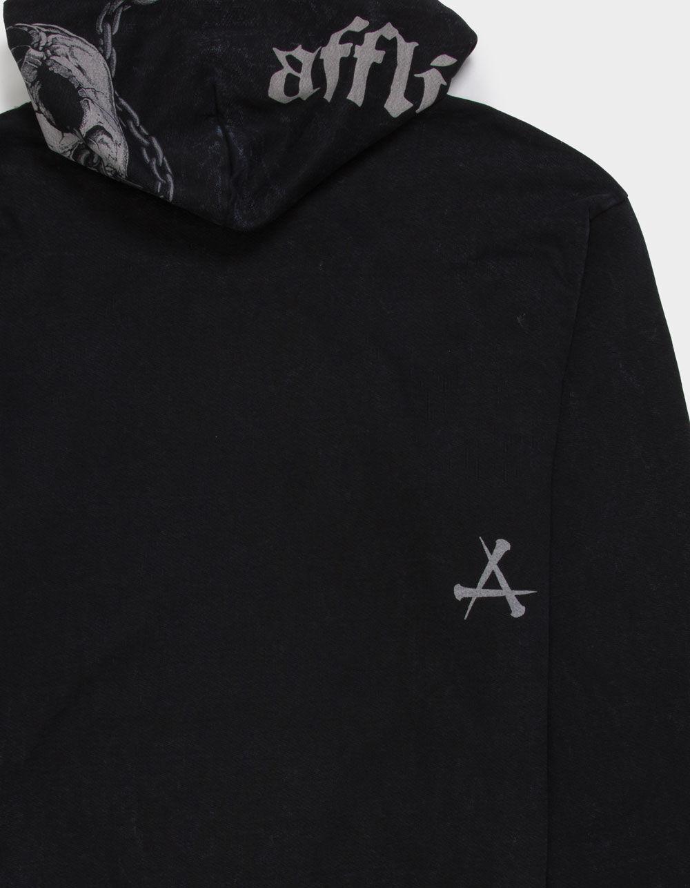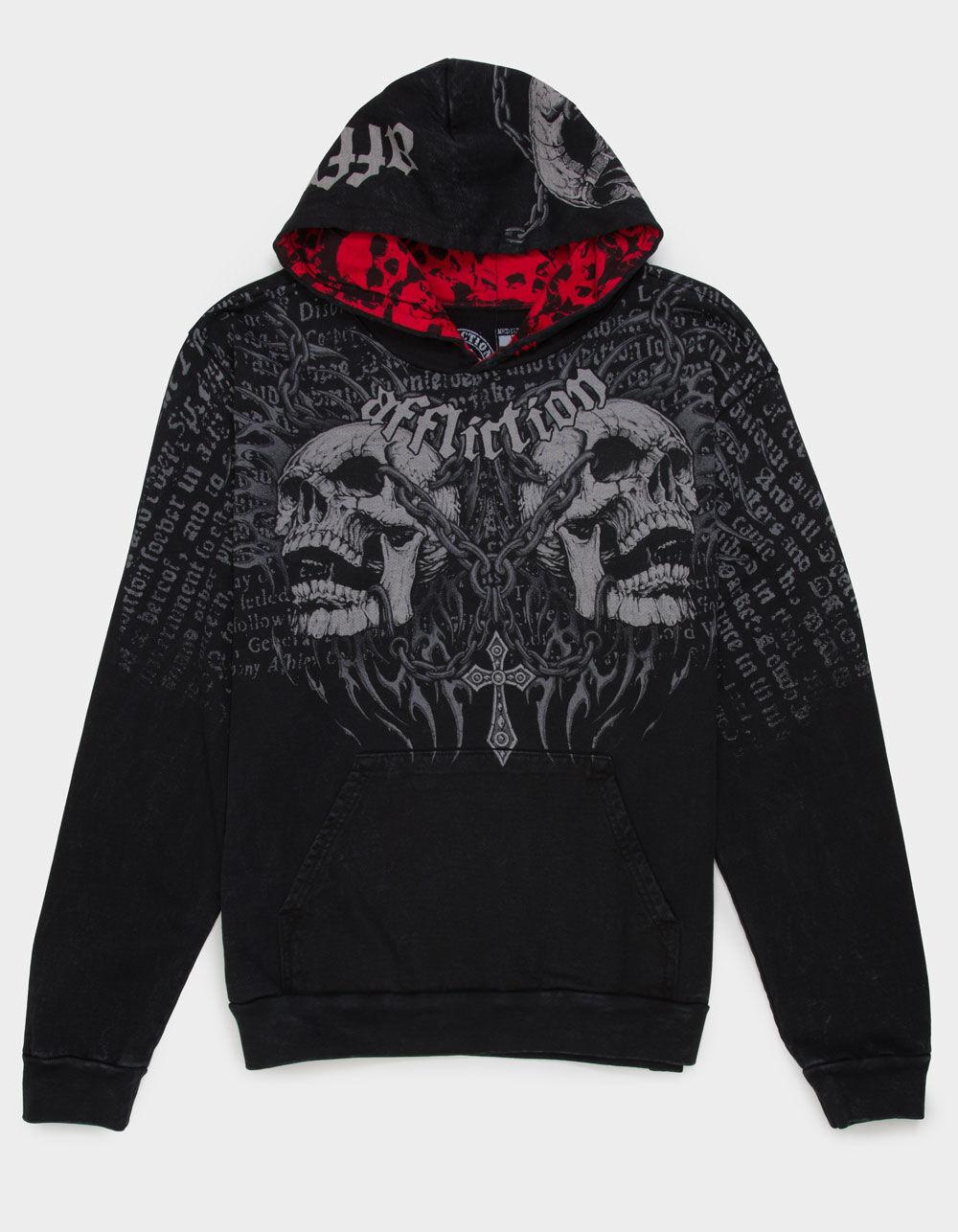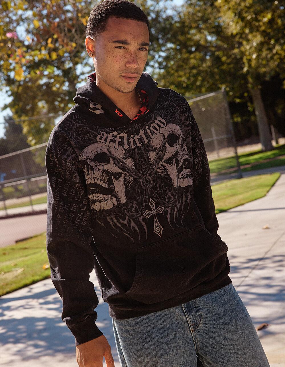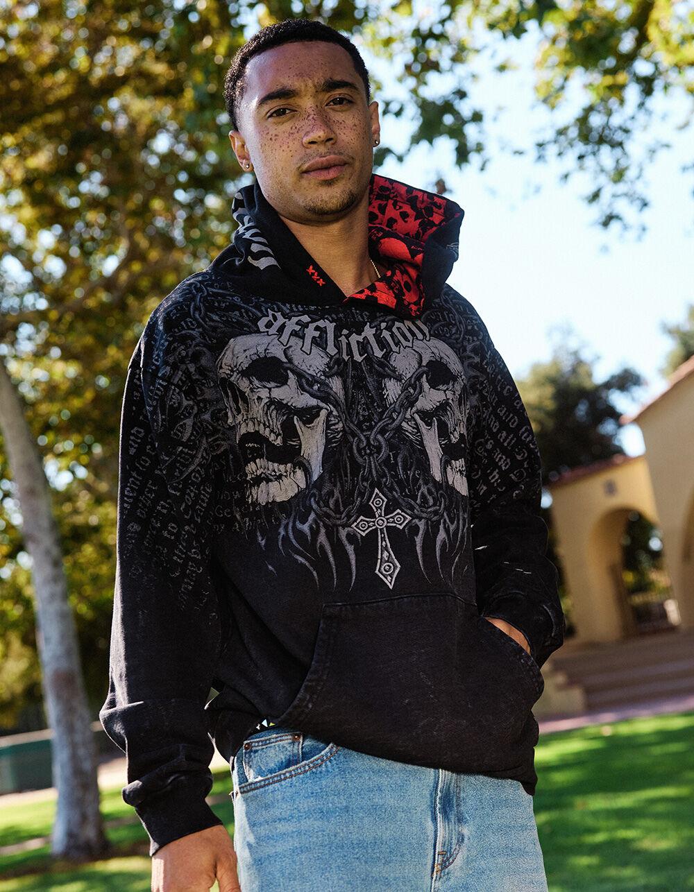 Affliction Decimation Hoodie. Graphics allover front and on upper sleeves. Logo screened at back right. Front pouch pocket. Fixed hood with graphics screened in hood lining. Fleece lining. Cuffed long sleeves and hem. 100% Cotton. Machine wash. Imported.