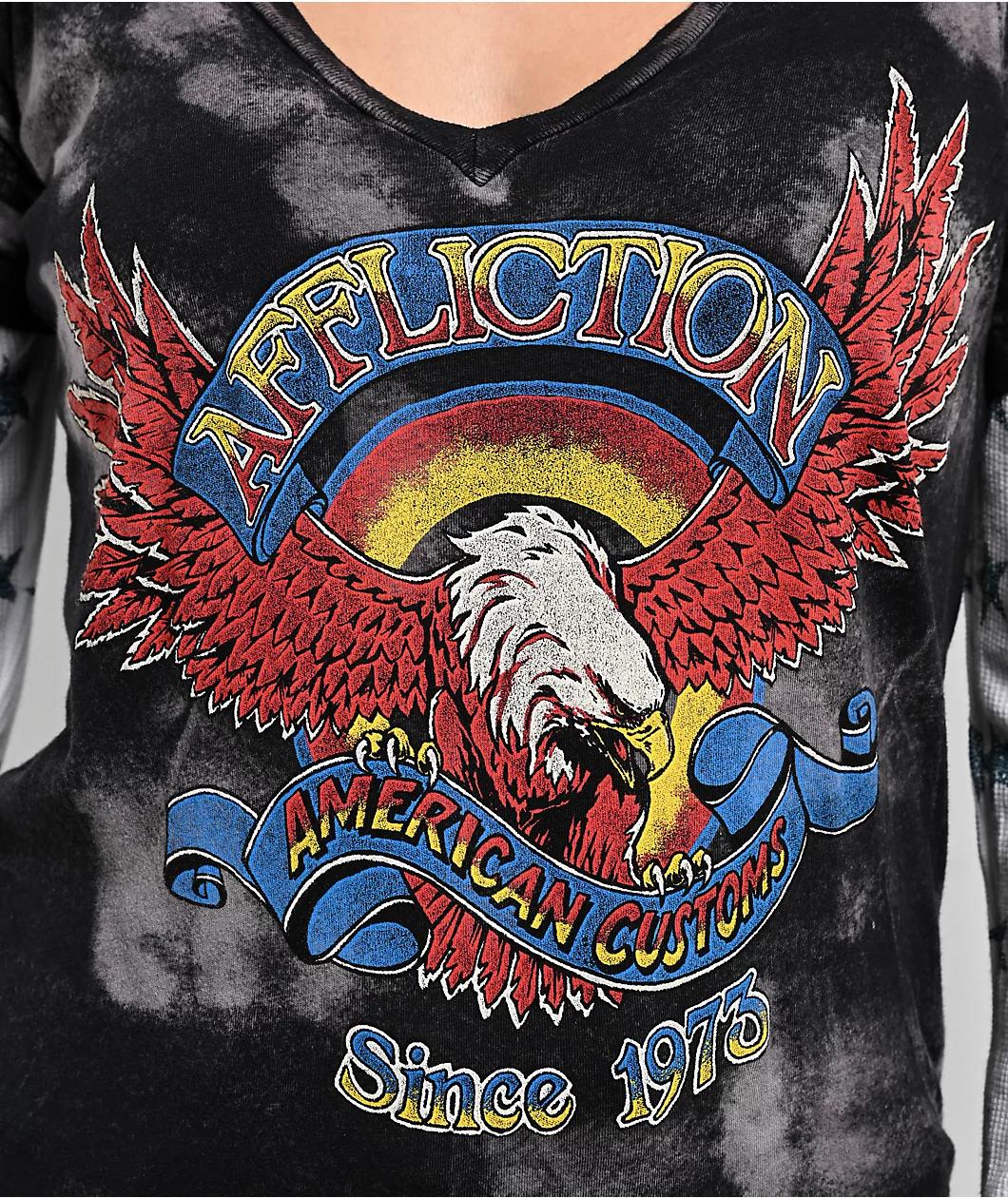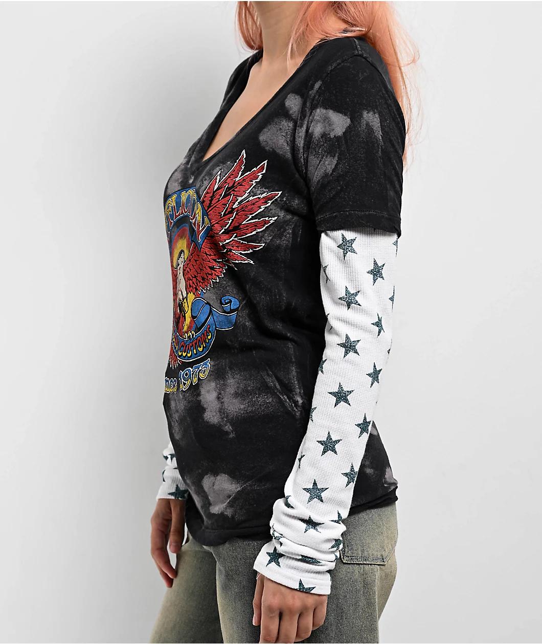 Affliction introduces the black and white Eagle Clutch t-shirt, featuring a layered 2fer design with thermal knit long sleeves. The white sleeves have screen-printed blue stars throughout, while the washed black center has graphics on the front and b