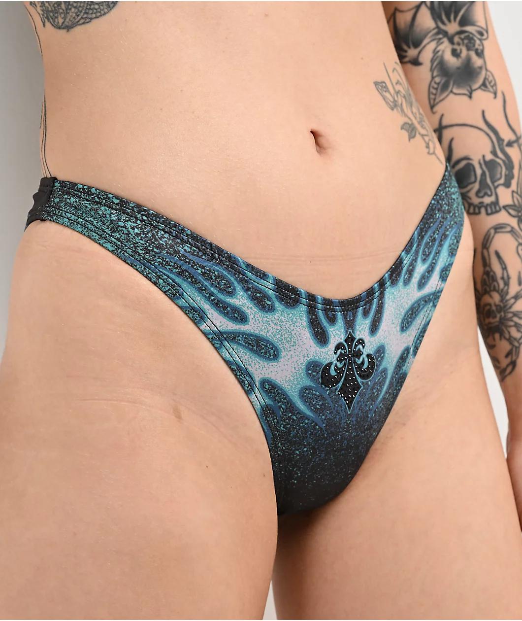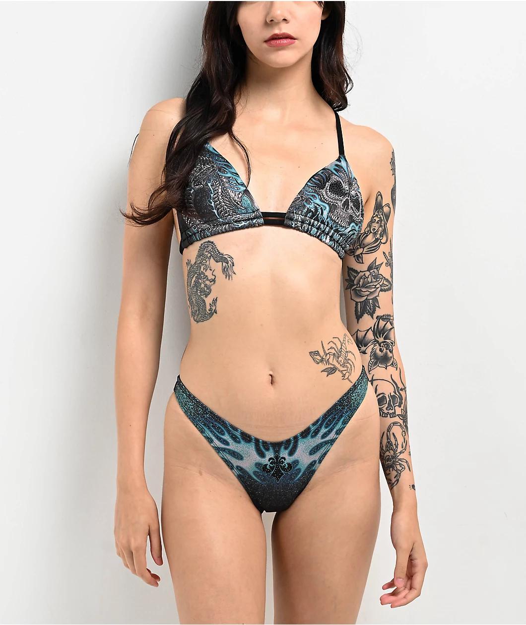 Make a statement in the black Electric Storm bikini bottom from Affliction, landing with a high leg fit. A sublimated graphic of a screaming skull among teal flames is decorated with silver and black rhinestones to stand out in the sun. The metal-ins