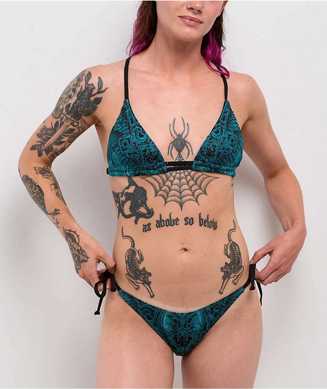Get ready for a day by the water with the Eternal Throne triangle bikini top from Affliction. The blue swim top showcases gothic designs throughout accented by black rhinestones. Tie back straps allow for a flattering, customizable fit.
