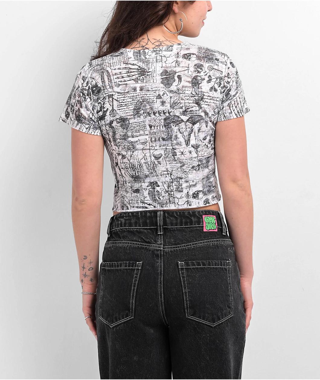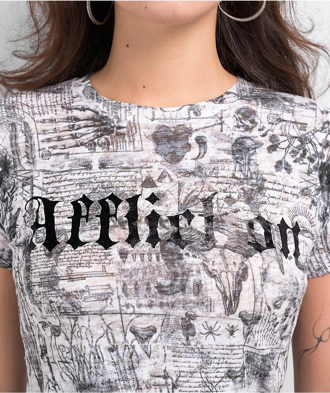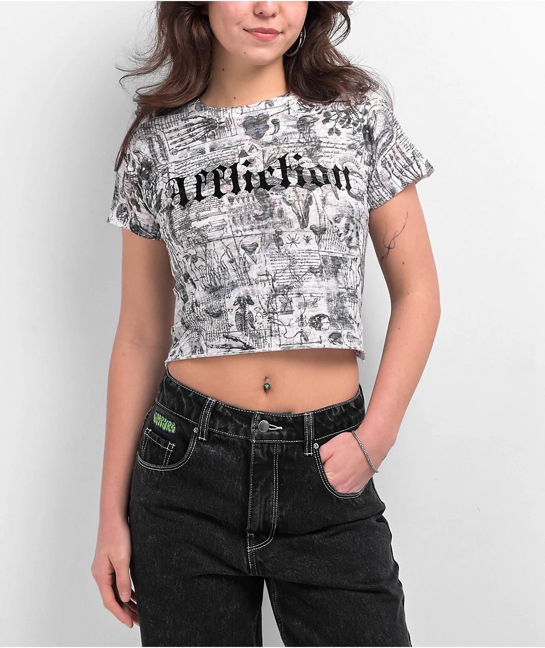 The minds at Affliction present the Iggy Punk t-shirt. The white crop top features medieval textbook style graphics throughout, with black foil Old English brand script adding eye-catching pop to the front. An unfinished bottom hem, as well as a burn