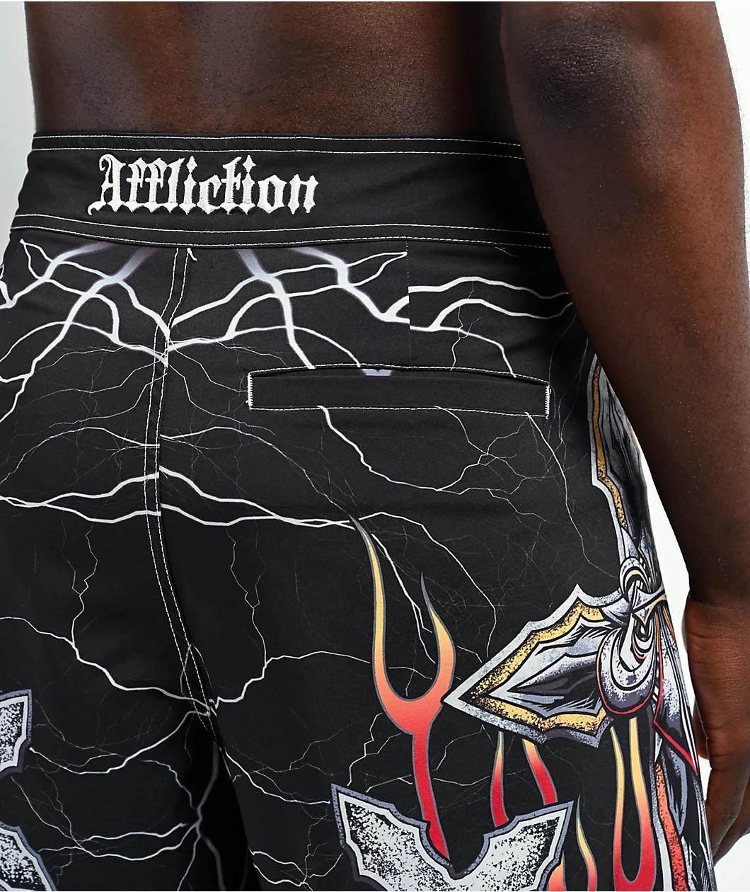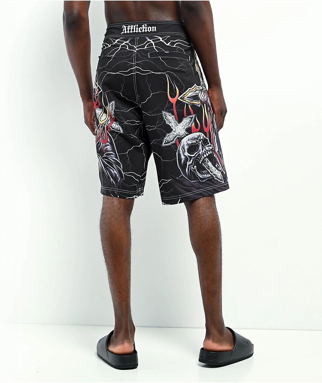 Make a stylish splash in the Phantom Fire board shorts from Affliction, presented in a black color with sublimated macabre images. Adorned with a crucifix-anchor skewering two human skulls on the right side and a praying Grim Reaper on the left side,