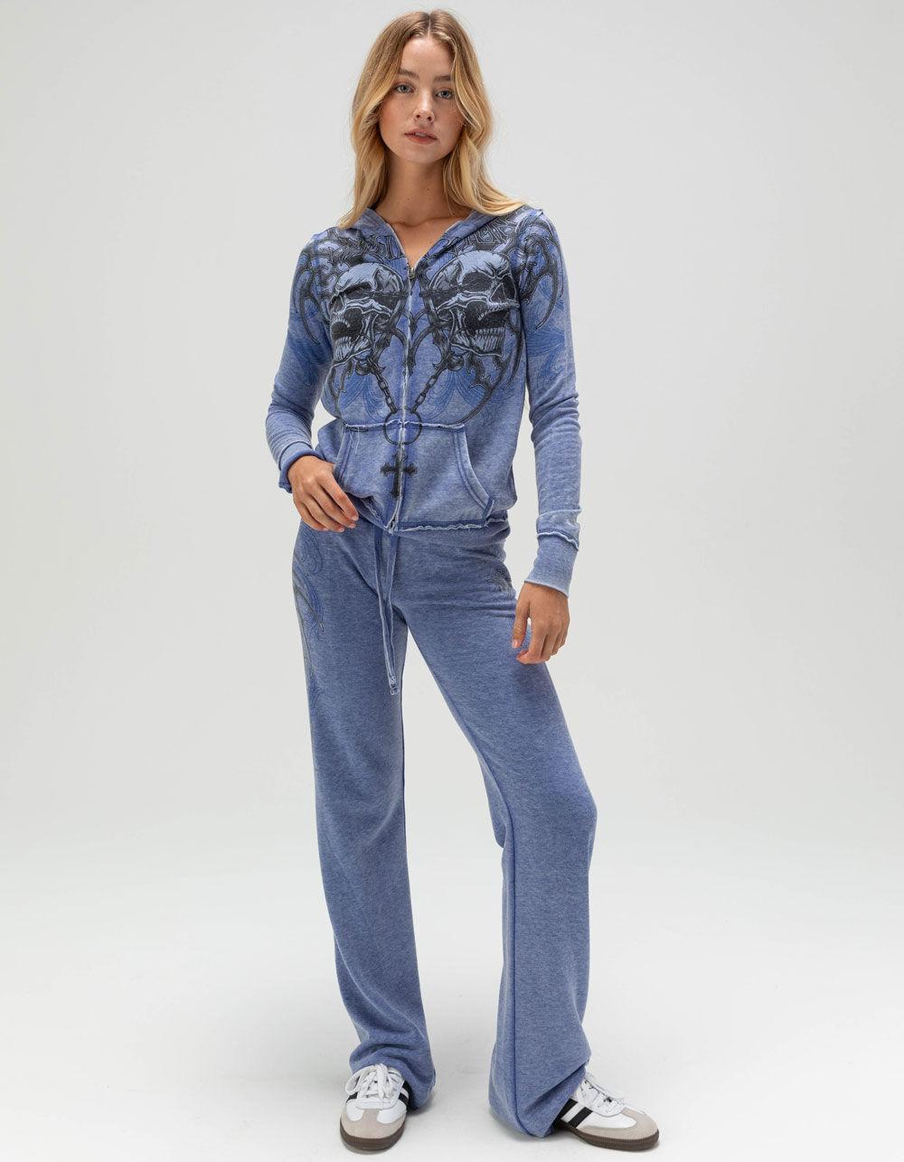 Affliction Shred Fest Burnout Zip-Up Hoodie. Large graphics on front. Silicone enzyme wash after print. Frayed details at seams and closure. Front pockets. Zip-up front closure. Fixed hood. Fleece lining. Cuffed long sleeves and hem. 55% Cotton 45% Polyester. Machine wash. Imported.