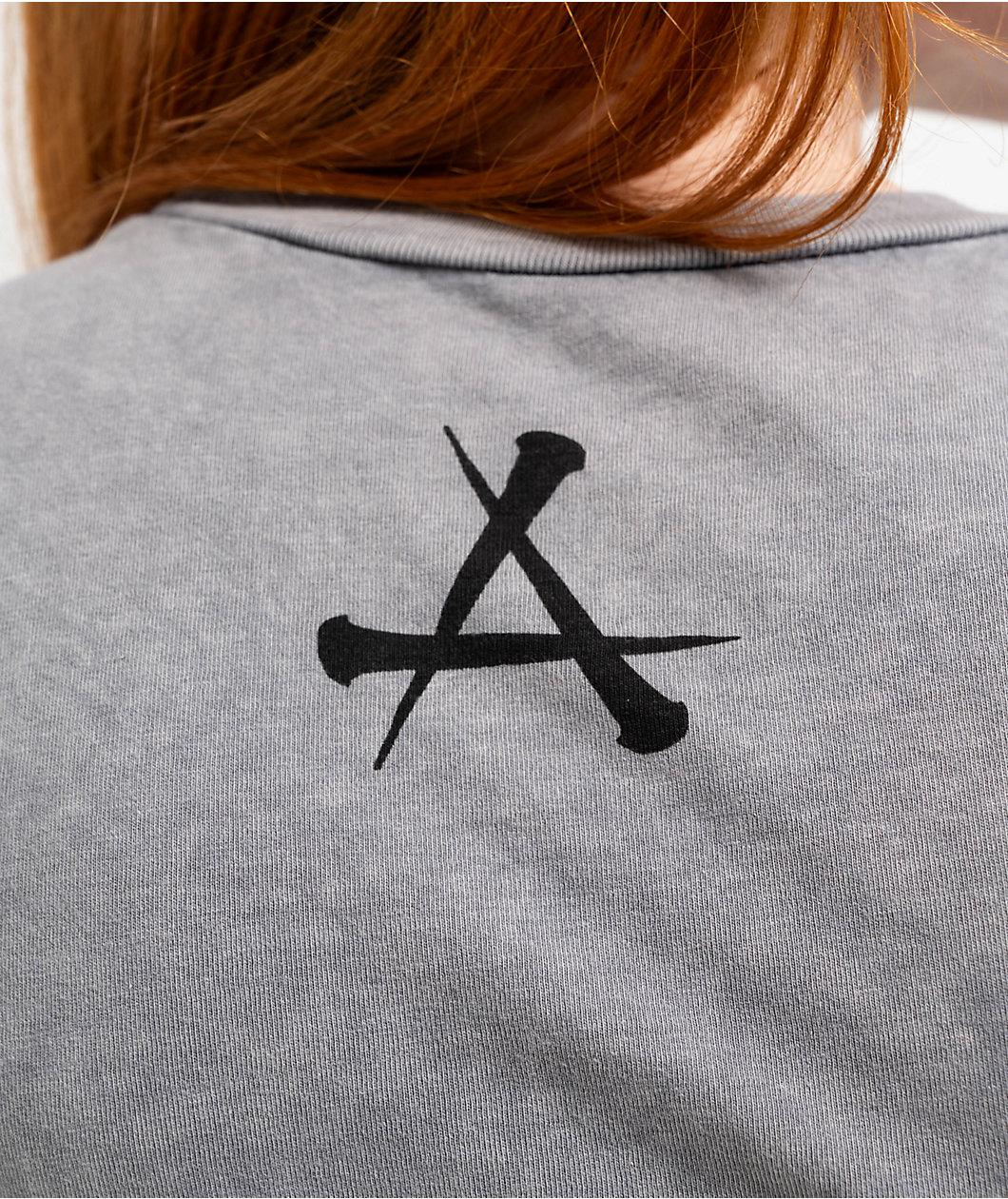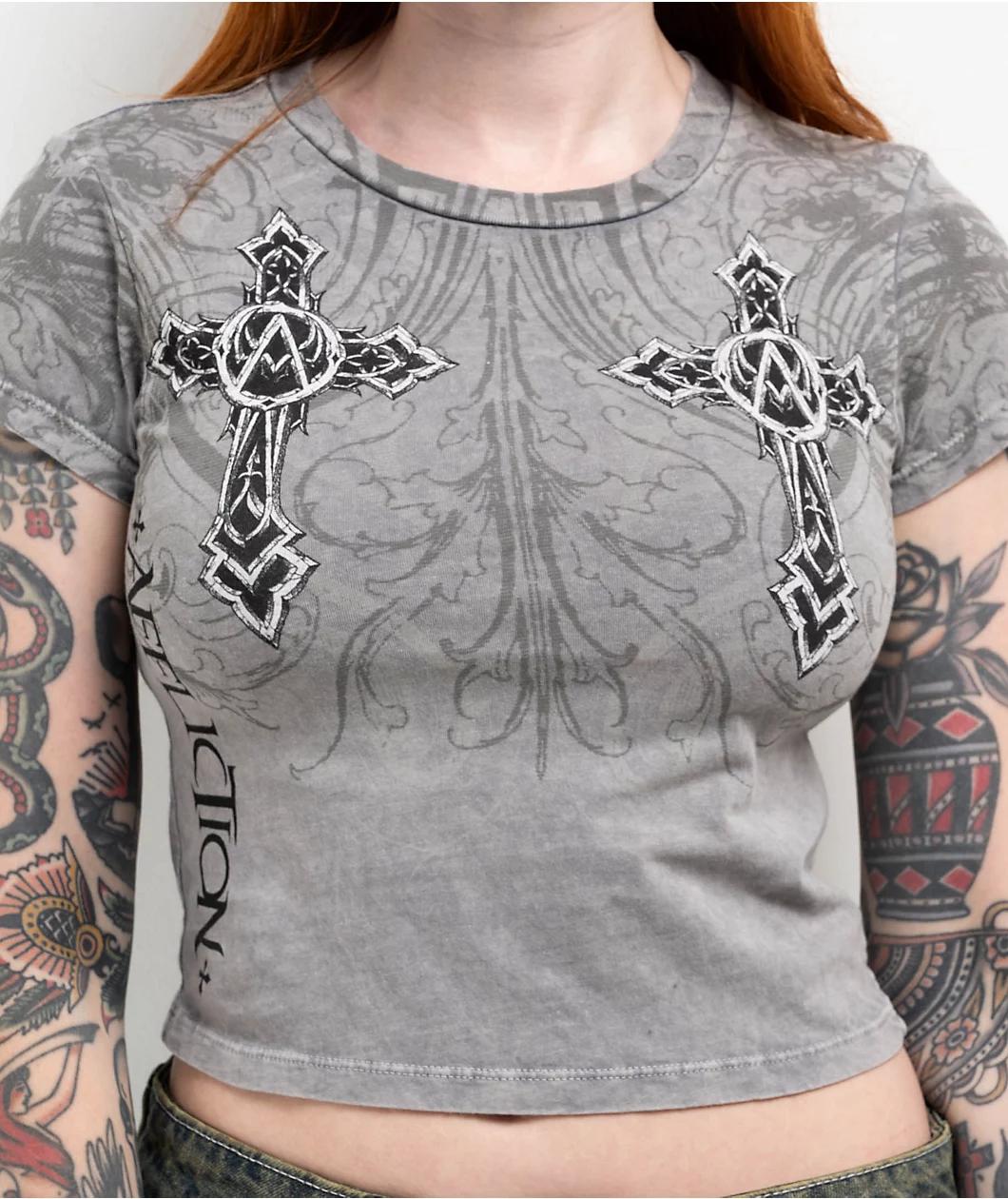 The Winged Dagger grey crop t-shirt lands from Affliction with a baby tee fit that's perfect for a casual outfit. A chest graphic showcases two gothic crosses in black and white, with dark grey detailing spread across the front and sleeves creating a