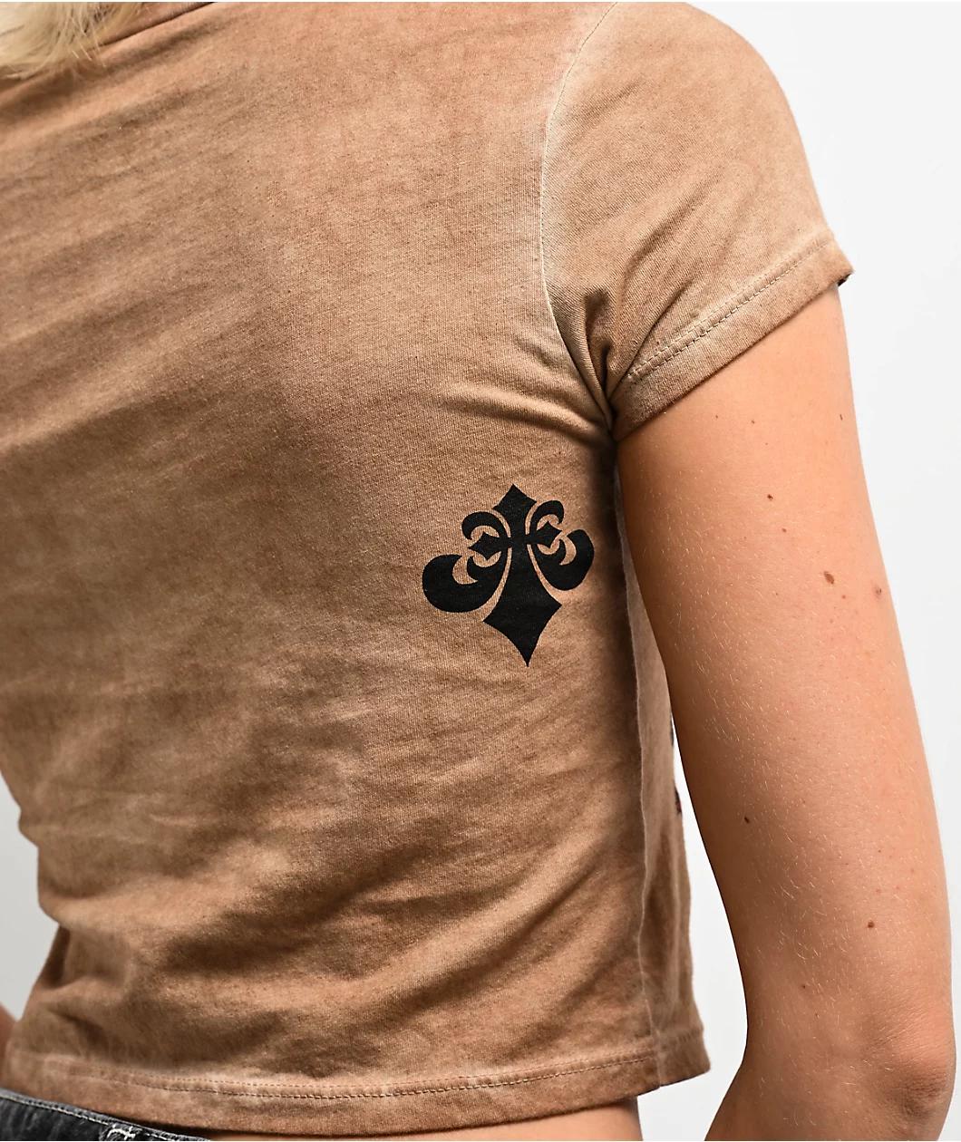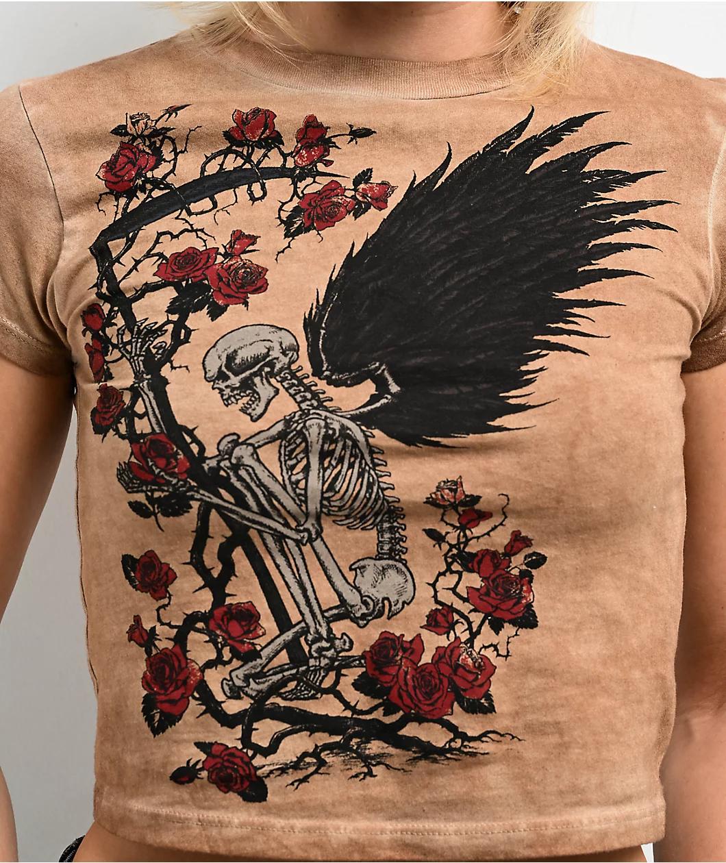 Add relaxed gothic style to any casual outfit with the brown mineral wash crop t-shirt from Affliction. The crop top features a Winged skeleton Reaper embracing a rose bush covered in thorns for an alternative, counterculture vibe. Fleur-de-lis brand