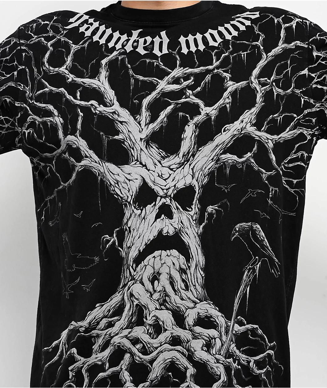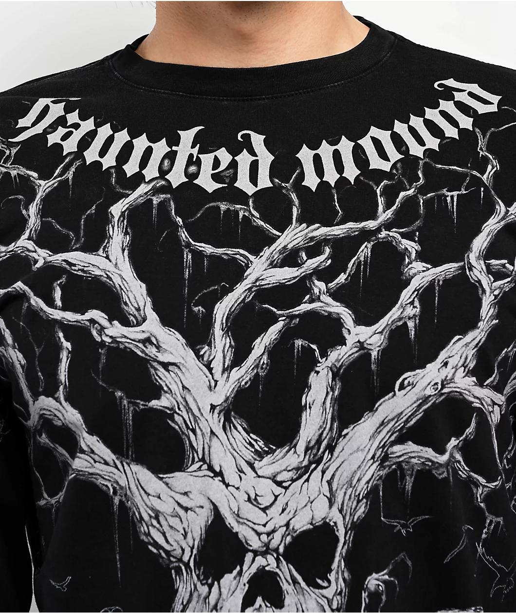 The tormented minds at Haunted Mound and Affliction bring you the Tree long sleeve t-shirt in an appropriately black tone with a washed treatment. Hosting a detailed illustration of the band's grim-faced Tree logo on the front, the back of the shirt