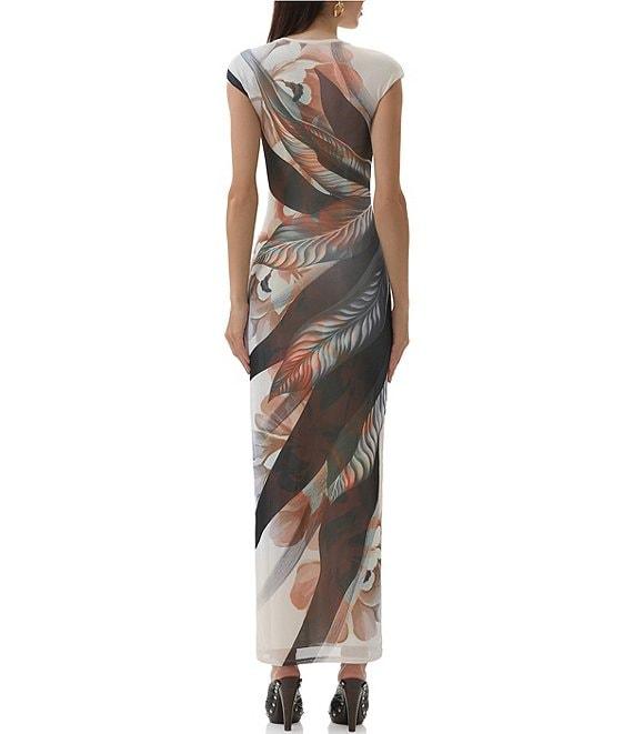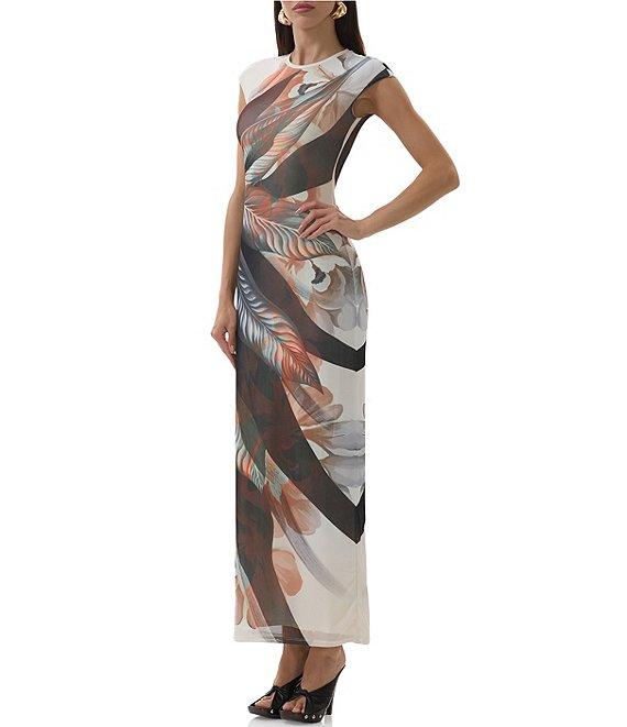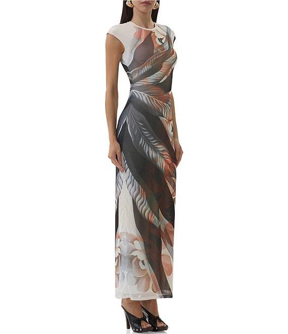 AFRM Cody Leaf Print Mesh Crew Neck Cap Sleeve Maxi Dress