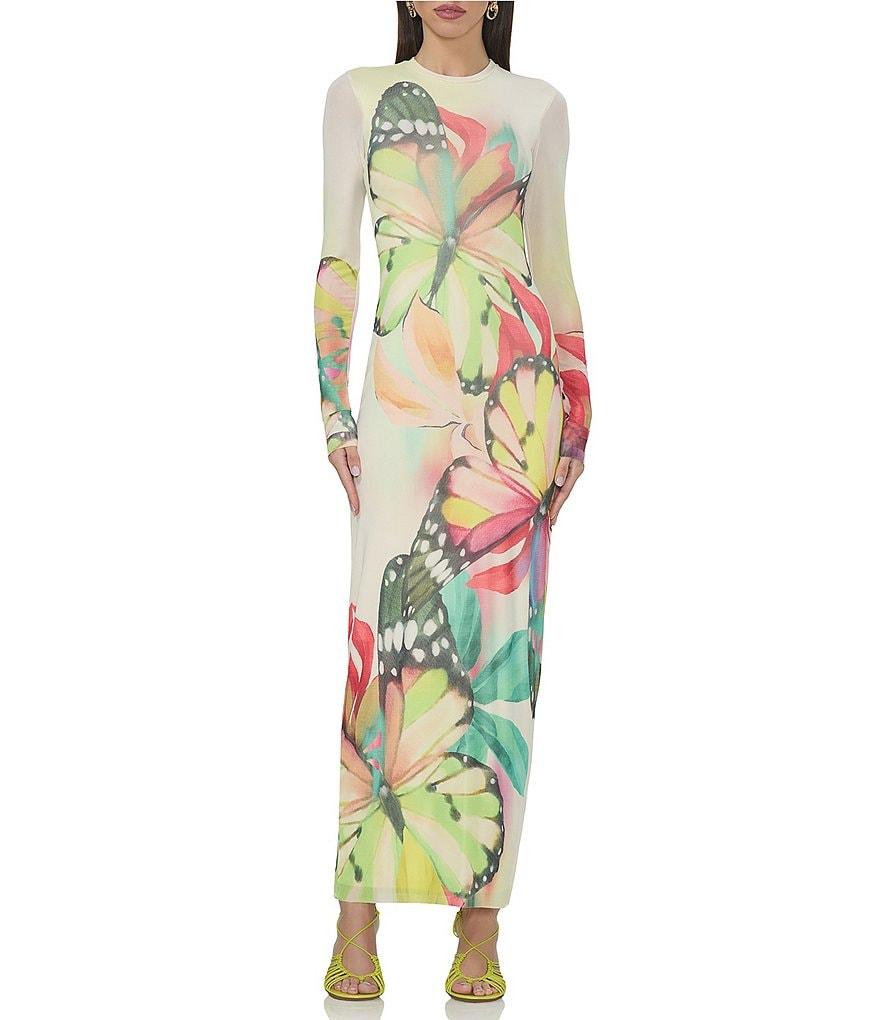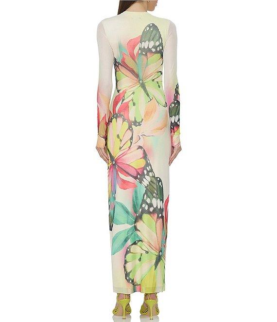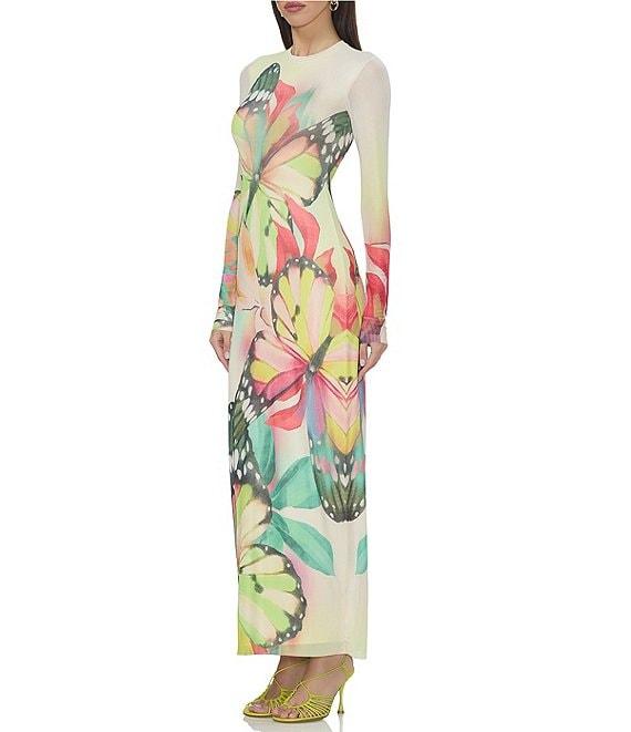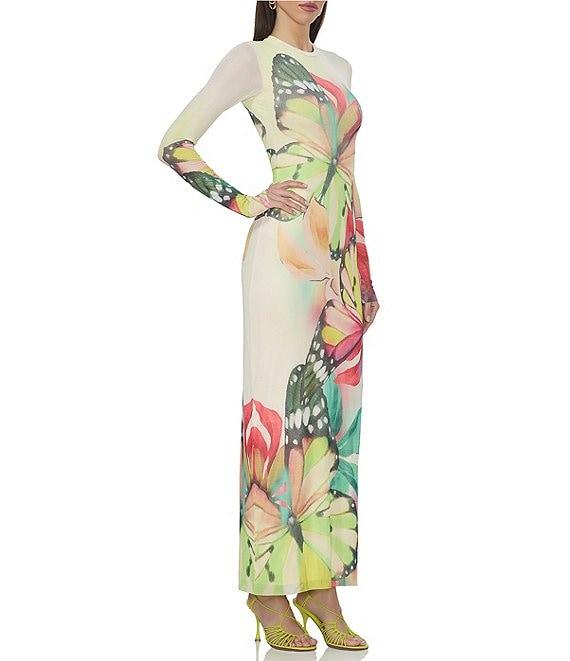 AFRM Didi Butterfly Printed Crewneck Longsleeve Ankle Mesh Maxi Dress