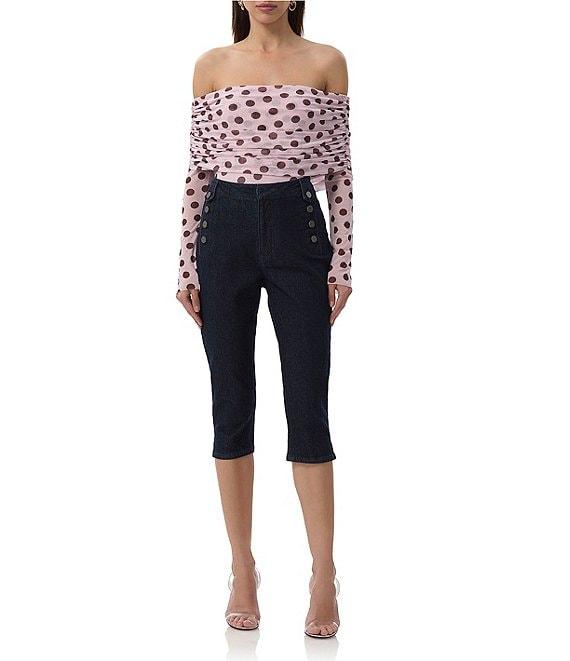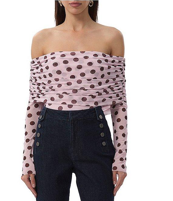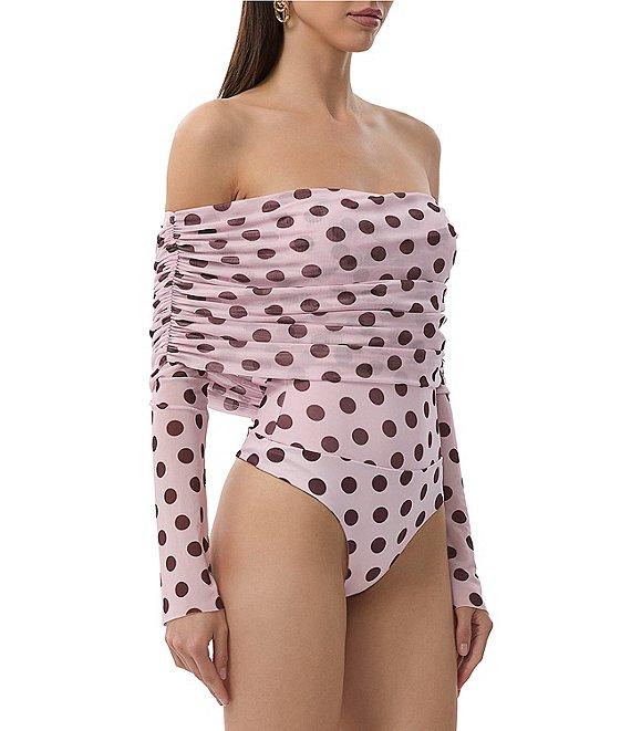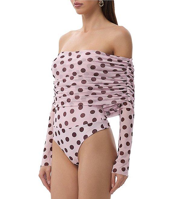 From AFRM, this bodysuit features: Power mesh fabrication Dot print Off-the-shoulder Long sleeves Pull-on construction Snap leg closure Lined Approx. 22.375" length Polyester/spandex; lining: polyester/spandex Machine wash/dry flat Imported.