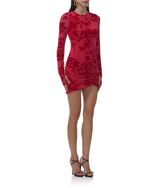 From AFRM, this dress features: Flocked mesh fabrication Floral flocked print Crew neckline Long sleeve Pull on construction Ruched detail Fitted silhouette Mini length Approx. 32" length Self: polyester/spandex Flocking: Nylon/other fibers Lining: Polyester/Spandex Dry clean Imported.
