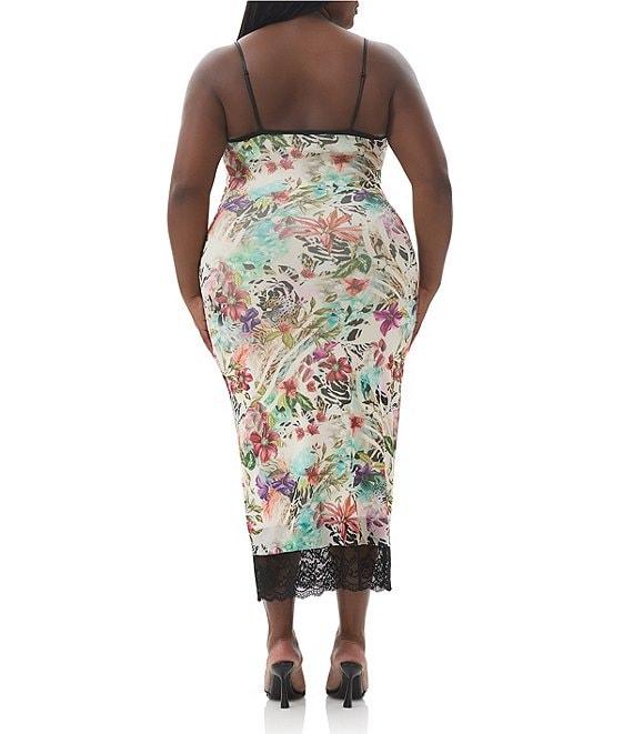 From AFRM Plus, this dress features: Stretch power mesh knit fabrication Floral print V-neckline Sleeveless Spaghetti straps Lace trim detail Pullover construction Approx. 36.25" length Polyester/spandex; lining: polyester/spandex Machine wash Imported.