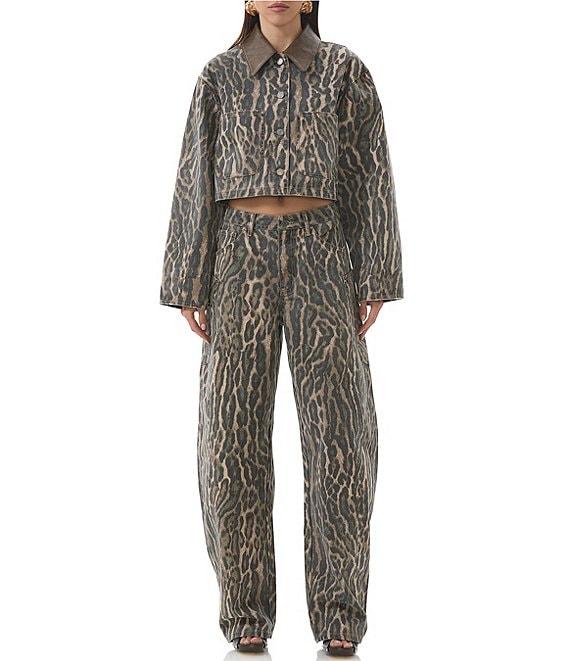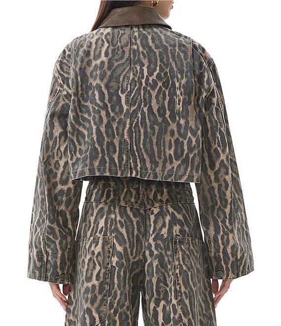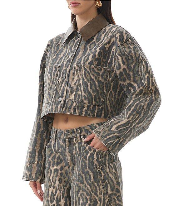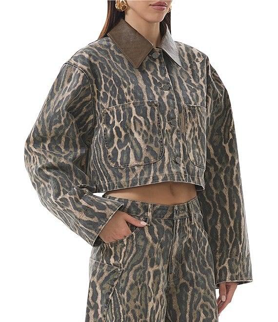 From AFRM, this jacket features: Canvas fabrication Leopard print Boxy crop silhouette Contrast point collar neckline Long wide sleeves Two chest patch pockets Oversize fit Straight hemline Button front closure Approx. 18.625" length Cotton Machine wash Imported.