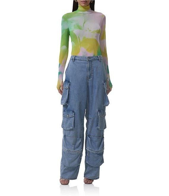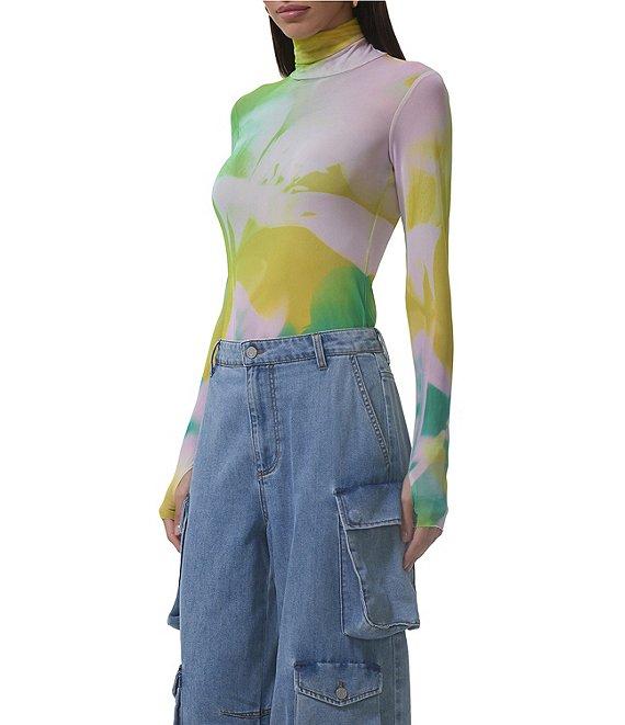 AFRM Zadie Watercolor Print Mock Neck Long Sleeve Mesh Top