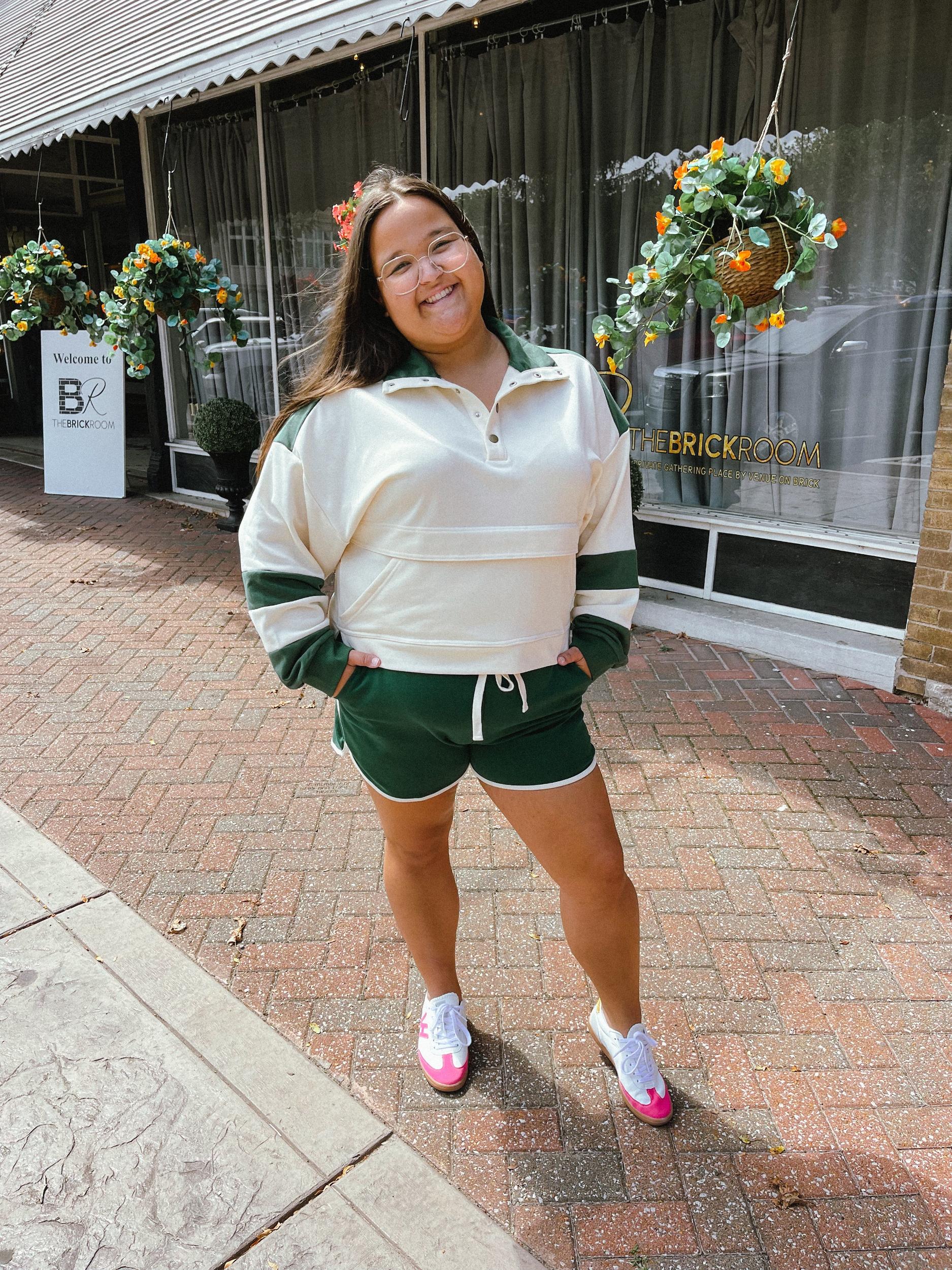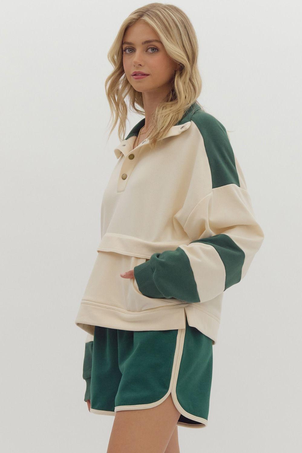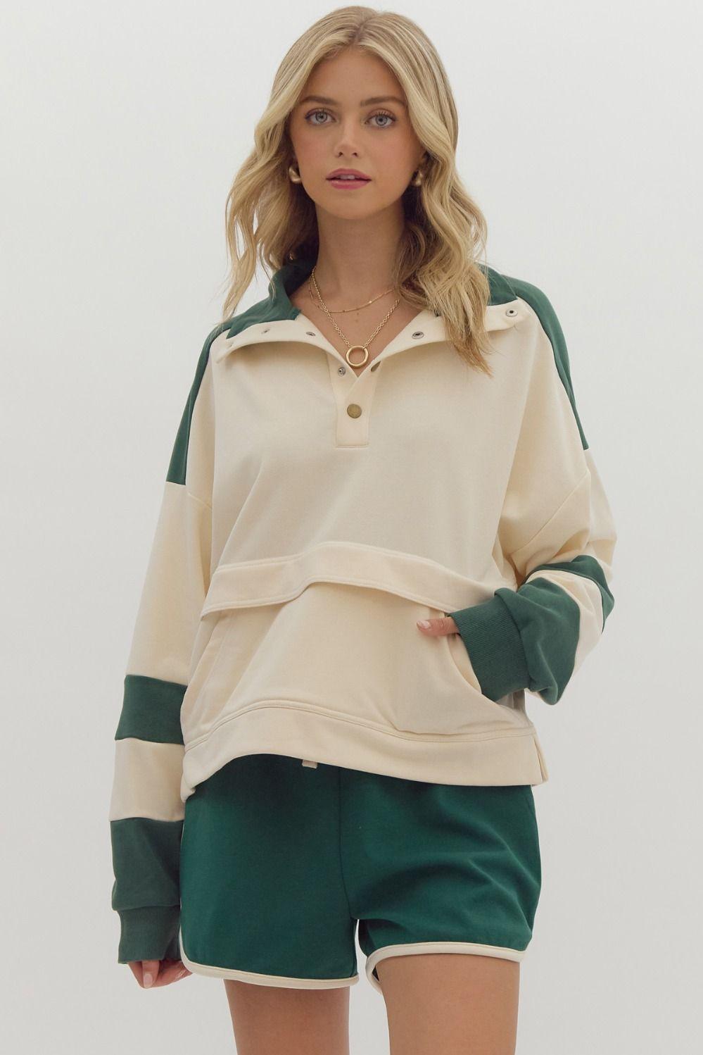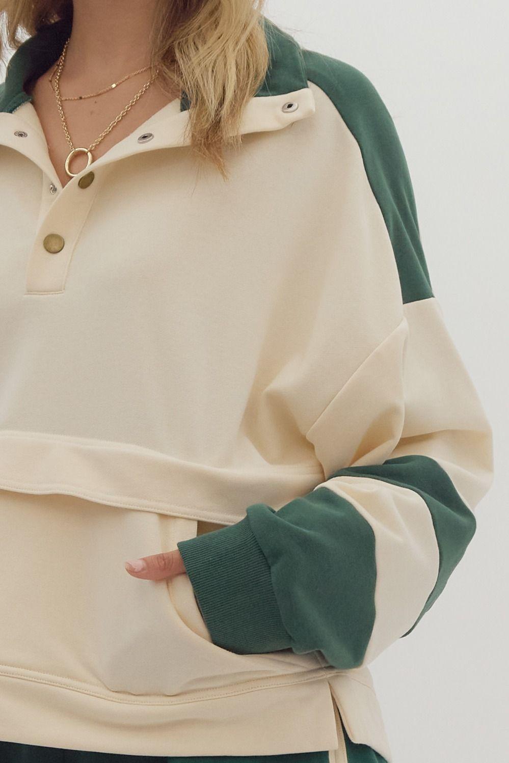 Stay cozy and stylish with our After School Pullover! This two tone color block sweater features a snap button closure at the neckline and convenient side pockets. Perfect for those chilly days post-school or work. No need to sacrifice fashion for comfort!