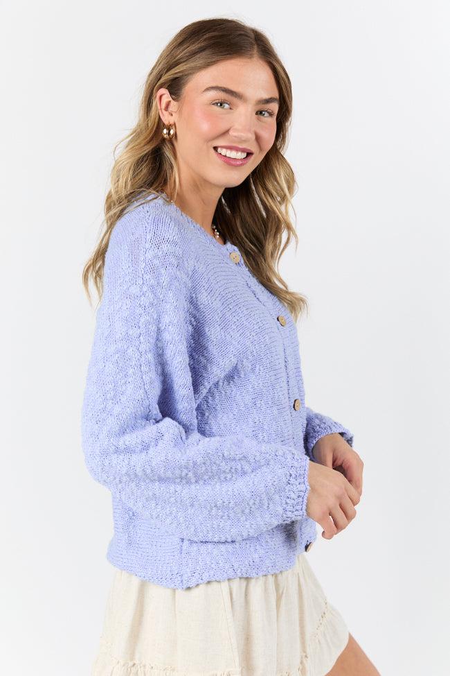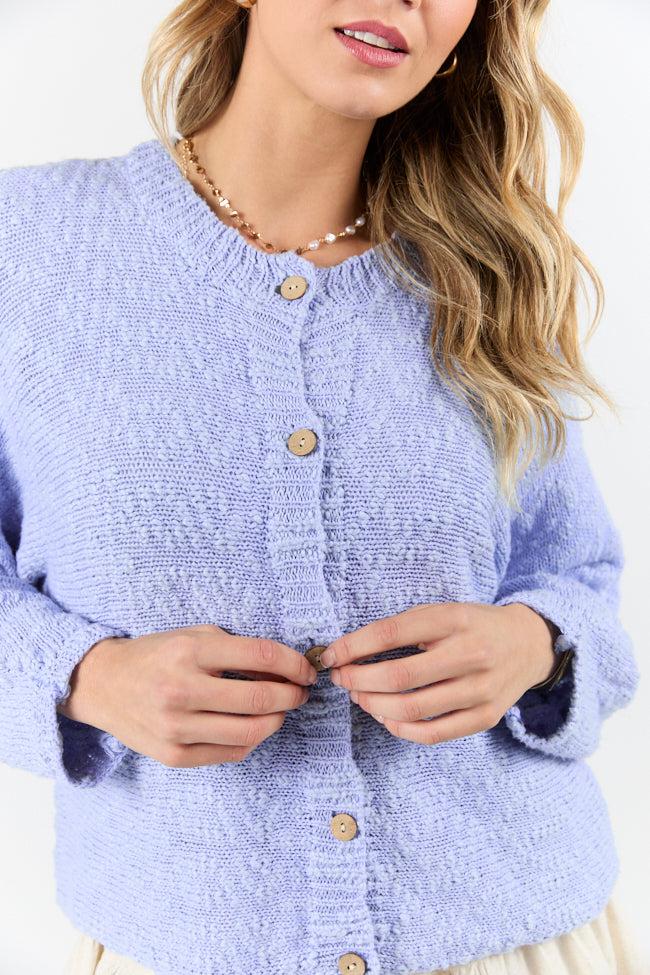 Details Light Weight Cardigan Blue Fabric has stretch Ribbed hem, functional button up closure Unlined Size small from shoulder to hem: 19" Material and Care 80% polyester 10% nylon 5% acrylic 5% viscose Hand wash cold, dry flat Patterns may vary Materials may have natural variations Colors may vary from different viewing devices.