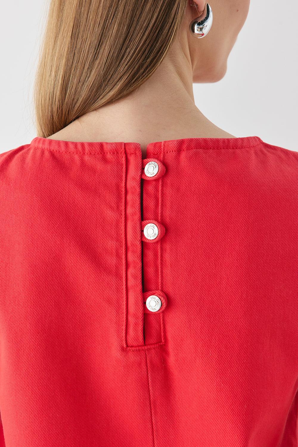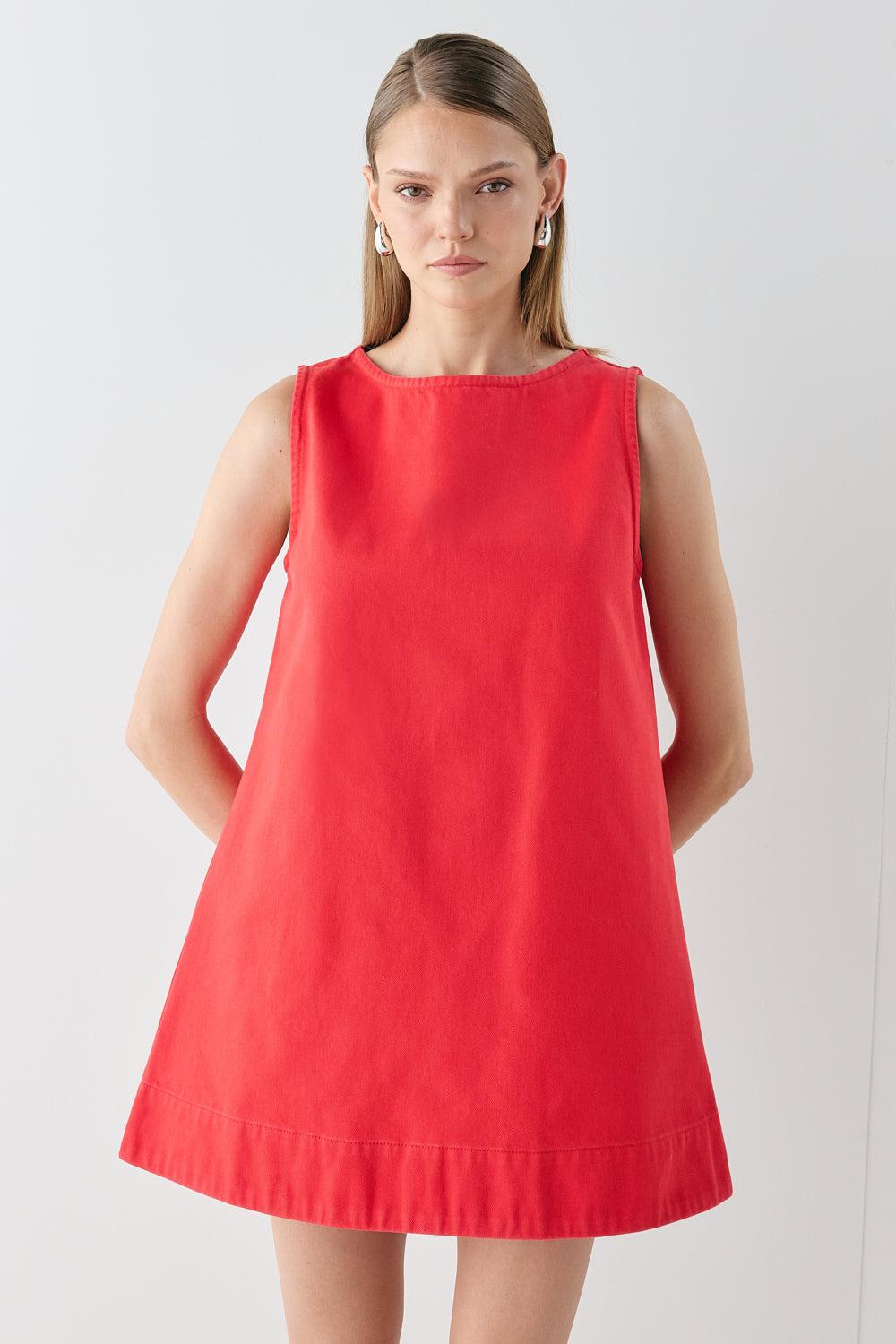The Aftersun Dress is cut from 100% cotton denim in a bold red, designed in a relaxed A-line fit with side splits at the hem for easy movement. A centre back button closure keeps the finish clean and simple. Pair it with the matching pants or wear it solo - easy to style, made to stand out.