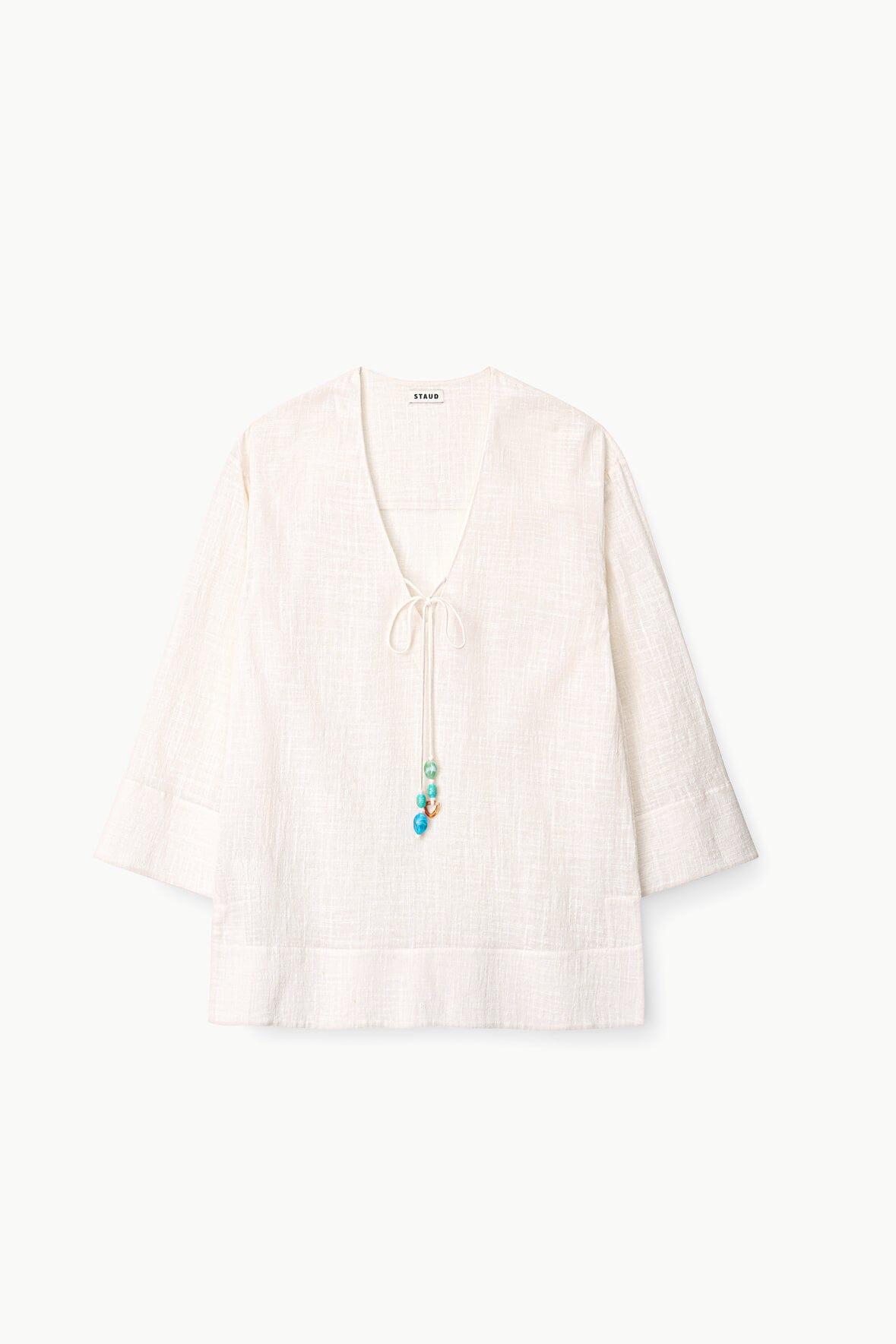 A v-neck mini tent dress made from a breezy cotton gauze material. This style features boxy long sleeves and turquoise bead details at the front ties.